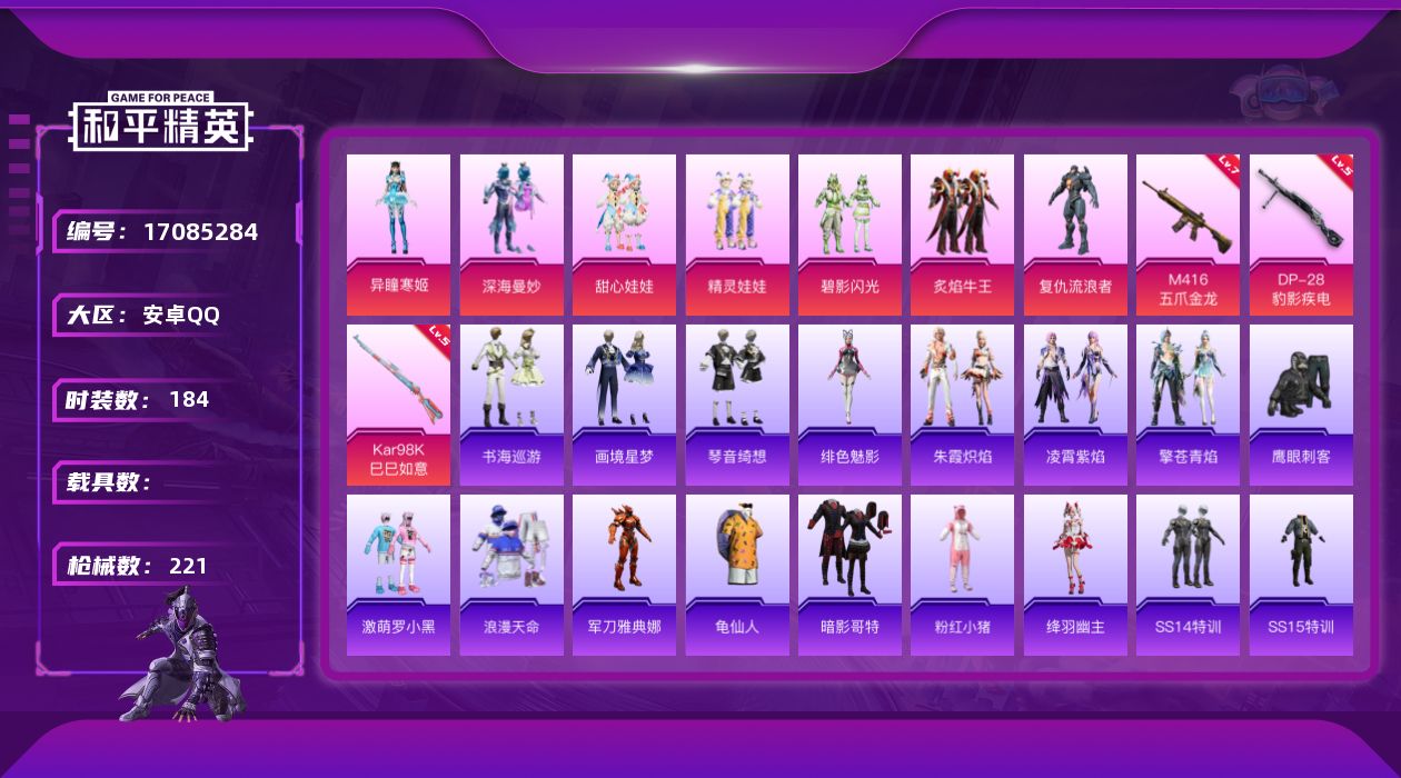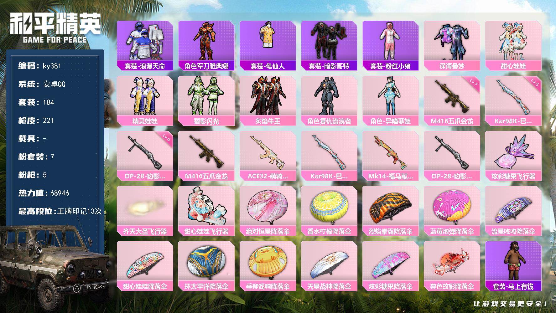 [17085284]安卓 手Q-7粉装-5特效枪-0载具-3粉色飞行器-68946热力值-13王牌印记-184套装-221枪皮