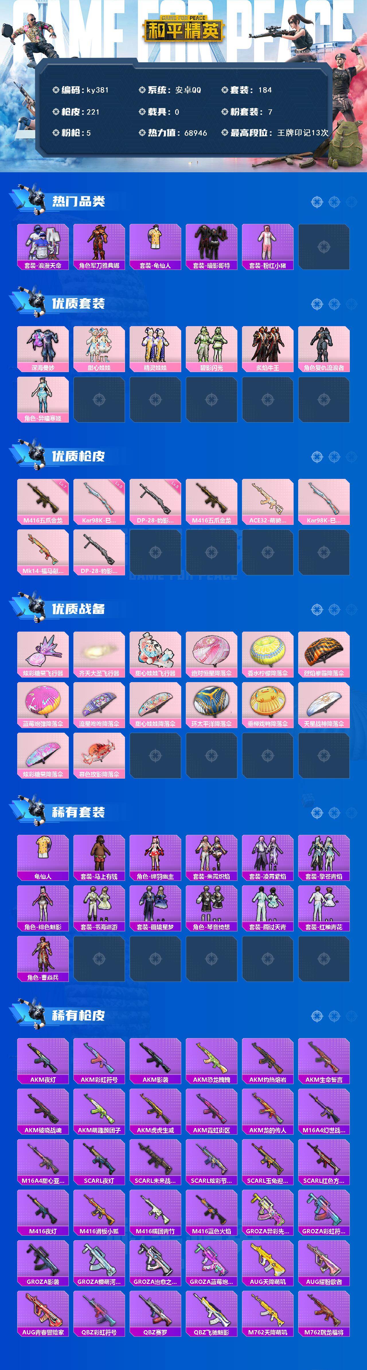 [17085284]安卓 手Q-7粉装-5特效枪-0载具-3粉色飞行器-68946热力值-13王牌印记-184套装-221枪皮 【热门品类】:套装-浪漫天命,角色-军刀雅典娜,套装-龟仙人,套装-暗影哥特,套装-粉红小猪 【粉色套装】:粉装-深海曼妙,粉装-甜心娃娃,粉装-精灵娃娃,粉装-碧影闪光,粉装-炙焰牛王,角色-复仇流浪者,角色-异瞳寒姬 【粉色枪皮等级】:M416-五爪金龙(七级),Kar98K-巳巳如意(五级),DP-28-豹影疾电(五级) 【粉色枪皮】:M416-五爪金龙,ACE32-萌骑漫游,Kar98K-巳巳如意,Mk14-福马献瑞,DP-28-豹影疾电 【粉色飞行器】:炫彩糖果飞行器,齐天大圣飞行器,甜心娃娃飞行器 【粉色降落伞】:绝对恒星降落伞,香水柠檬降落伞,烈焰拳霸降落伞,蓝莓炮弹降落伞,流星咚咚降落伞,甜心娃娃降落伞,环太平洋降落伞,垂柳戏鸭降落伞,天星战神降落伞,炫彩糖果降落伞,暮色玫影降落伞 【稀有套装】:套装-龟仙人,套装-马上有钱,角色-绛羽幽主,套装-朱霞炽焰,套装-凌霄紫焰,套装-擎苍青焰,角色-绯色魅影,套装-书海巡游,套装-画境星梦,套装-琴音绮想,套装-雨过天青,套装-红釉青花,角色-曹焱兵 【稀有枪皮】:AKM-夜灯,AKM-彩虹符号,AKM-影袭,AKM-恐龙拽拽,AKM-灼热熔岩,AKM-生命誓言,AKM-破晓战魂,AKM-萌趣颜团子,AKM-虎虎生威,AKM-霓虹街区,AKM-龙的传人,M16A4-幻世战舞者,M16A4-甜心亚梦,SCAR-L-夜灯,SCAR-L-未来战士,SCAR-L-炫彩节奏,SCAR-L-玉兔迎春,SCAR-L-红色方程式,M416-夜灯,M416-滑板小狐,M416-糯团青竹,M416-蓝色火焰,GROZA-异彩先驱,GROZA-彩虹符号,GROZA-影袭,GROZA-懵萌河马,GROZA-治愈之星,GROZA-蓝莓炮弹,AUG-天降萌叽,AUG-耀粉歌者,AUG-青春冒险家,QBZ-彩虹符号,QBZ-赛罗,QBZ-飞驰魅影,M762-天降萌叽,M762-瑞龙福将,M762-甜心宝贝,M762-绯红前夜,Mk47-百万伏特,Mk47-青春冒险家,G36C-懵萌河马,G36C-时空追击者,AC-VAL-天降萌叽,AC-VAL-甜心亚梦,AC-VAL-闲梦青缨,蜜獾-天降萌叽,蜜獾-娇憨猪猪,蜜獾-绯穹魔姬,
