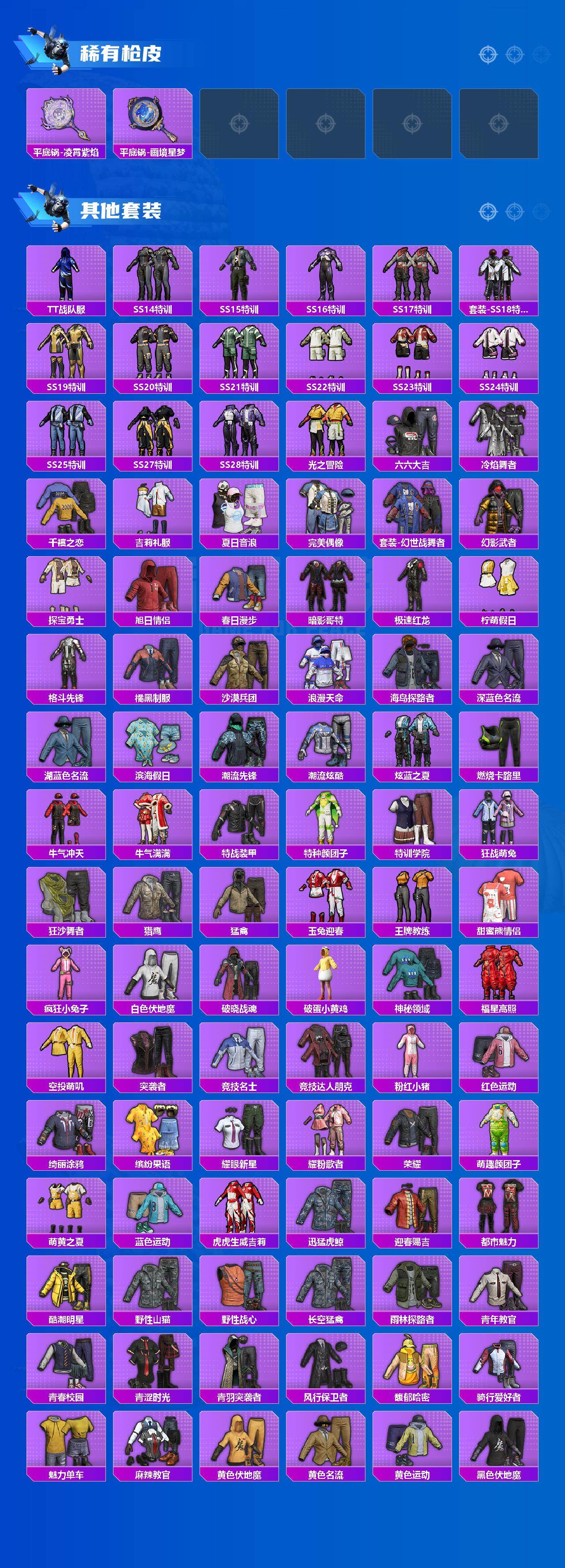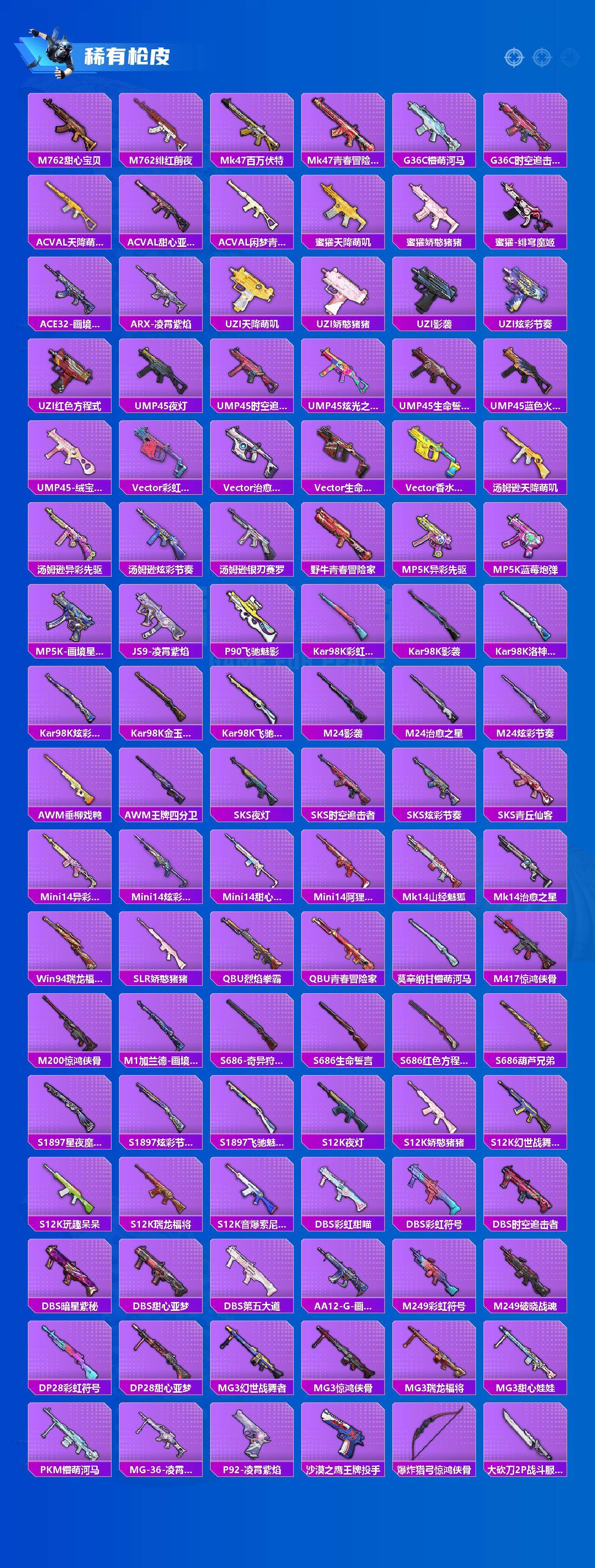 【稀有枪皮】:AKM-夜灯,AKM-彩虹符号,AKM-影袭,AKM-恐龙拽拽,AKM-灼热熔岩,AKM-生命誓言,AKM-破晓战魂,AKM-萌趣颜团子,AKM-虎虎生威,AKM-霓虹街区,AKM-龙的传人,M16A4-幻世战舞者,M16A4-甜心亚梦,SCAR-L-夜灯,SCAR-L-未来战士,SCAR-L-炫彩节奏,SCAR-L-玉兔迎春,SCAR-L-红色方程式,M416-夜灯,M416-滑板小狐,M416-糯团青竹,M416-蓝色火焰,GROZA-异彩先驱,GROZA-彩虹符号,GROZA-影袭,GROZA-懵萌河马,GROZA-治愈之星,GROZA-蓝莓炮弹,AUG-天降萌叽,AUG-耀粉歌者,AUG-青春冒险家,QBZ-彩虹符号,QBZ-赛罗,QBZ-飞驰魅影,M762-天降萌叽,M762-瑞龙福将,M762-甜心宝贝,M762-绯红前夜,Mk47-百万伏特,Mk47-青春冒险家,G36C-懵萌河马,G36C-时空追击者,AC-VAL-天降萌叽,AC-VAL-甜心亚梦,AC-VAL-闲梦青缨,蜜獾-天降萌叽,蜜獾-娇憨猪猪,蜜獾-绯穹魔姬,