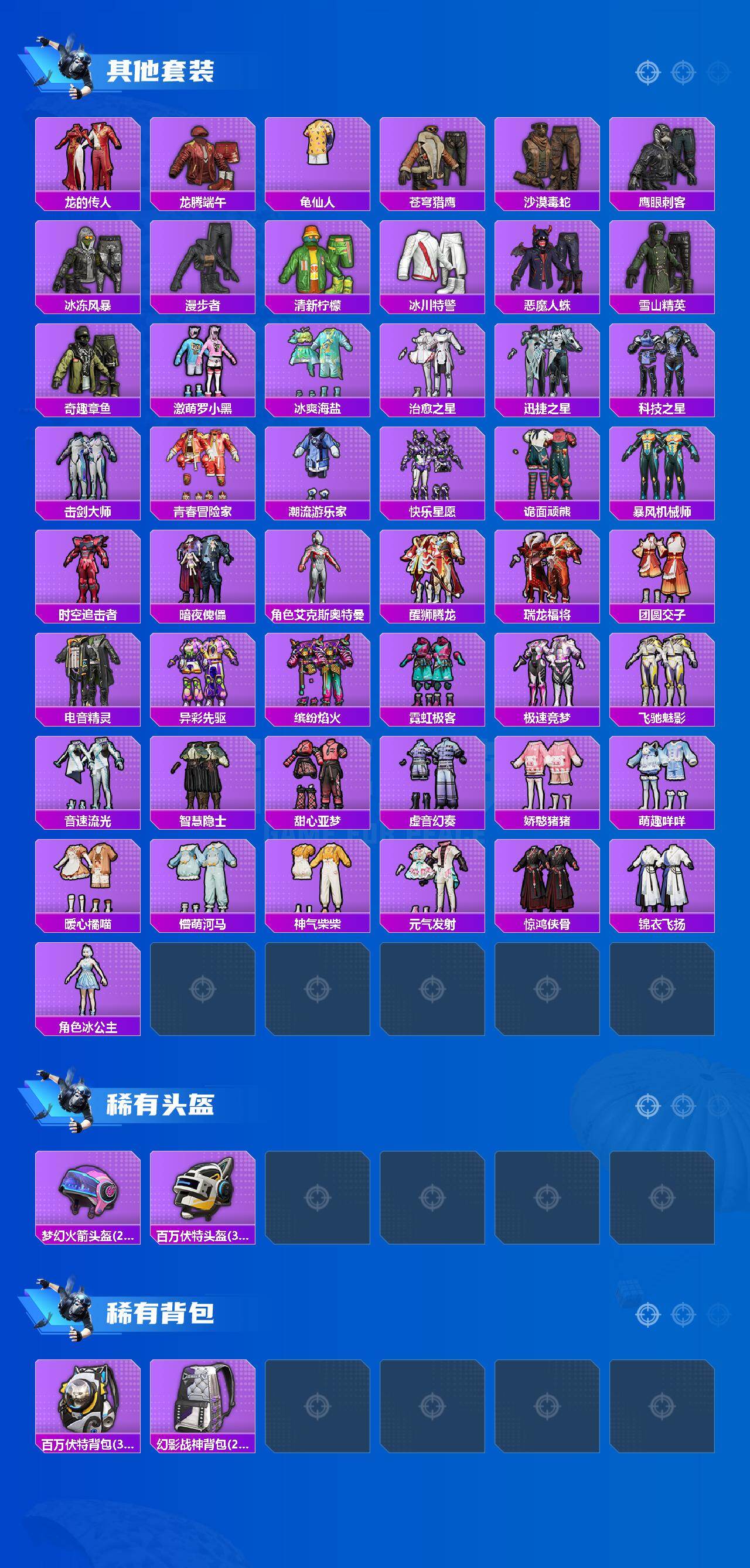 - [9779626]实名: 可修改 时装数: 715 载具数: 6 枪械数: 218 战备数: 173 热门装扮: 火箭少女101(老101),梦幻火箭(新101),呆萌铁蟹,深海小丑鱼,星之信仰,梦魇先生,放客神游,万圣娃娃,迅捷狂鲨,鹰眼刺客,缤纷油彩,新星烈龙,馨动时刻,灵感创作师,胖达圆圆,飒粉甜心,小可学妹,呆萌星弥,未来歌姬,拂晓神骑,炫光之旅,水仙星,勇猛狮王,双面双生,室女星神,宙之时溯,傲傲奶龙,冰炎战车,圣堂之誓,小叽联名款,电磁星,创世·救赎,时空协奏·心弦,星穹咏叹调 载具: 合金龙骨(蓝),兰博基尼Estoque(银翼灰),兰博基尼Aventador SVJ(翡翠绿),路特斯ELETRE(花绽灰),照夜玉狮子,幽澜尊爵(静谧蓝) 稀有枪皮: AKM梦之光华,M416风花雪月,AKM白勺歌姬,AMR炫光之旅,MG3酷泡奶龙,SCAR-L-锦绣绵绵,SPAS-12蜜语绒猫,UMP45量子极限,Kar98K-巳巳如意,AUG-暖羊咩咩