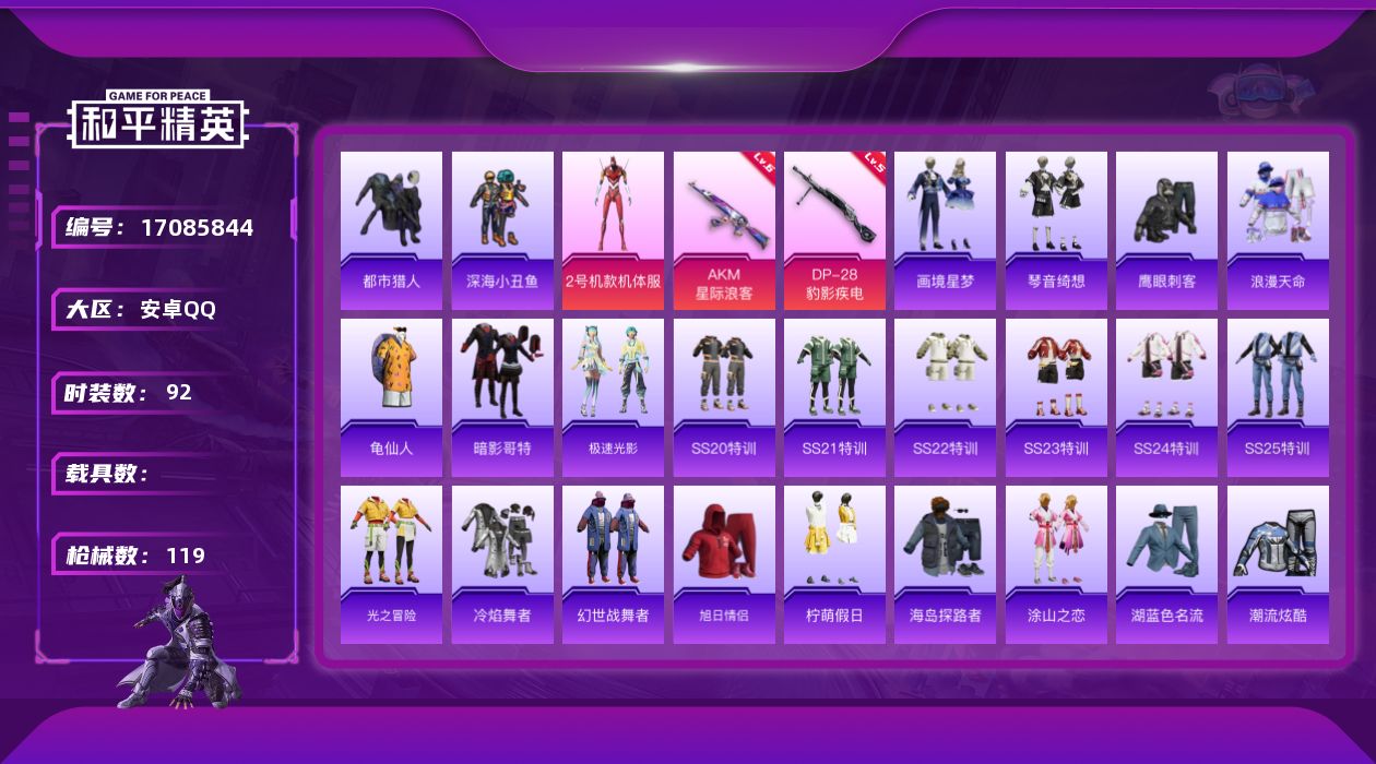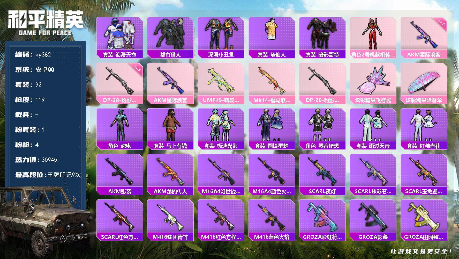 [17085844]安卓 手Q-1粉装-4特效枪-0载具-1粉色飞行器-30945热力值-9王牌印记-92套装-119枪皮