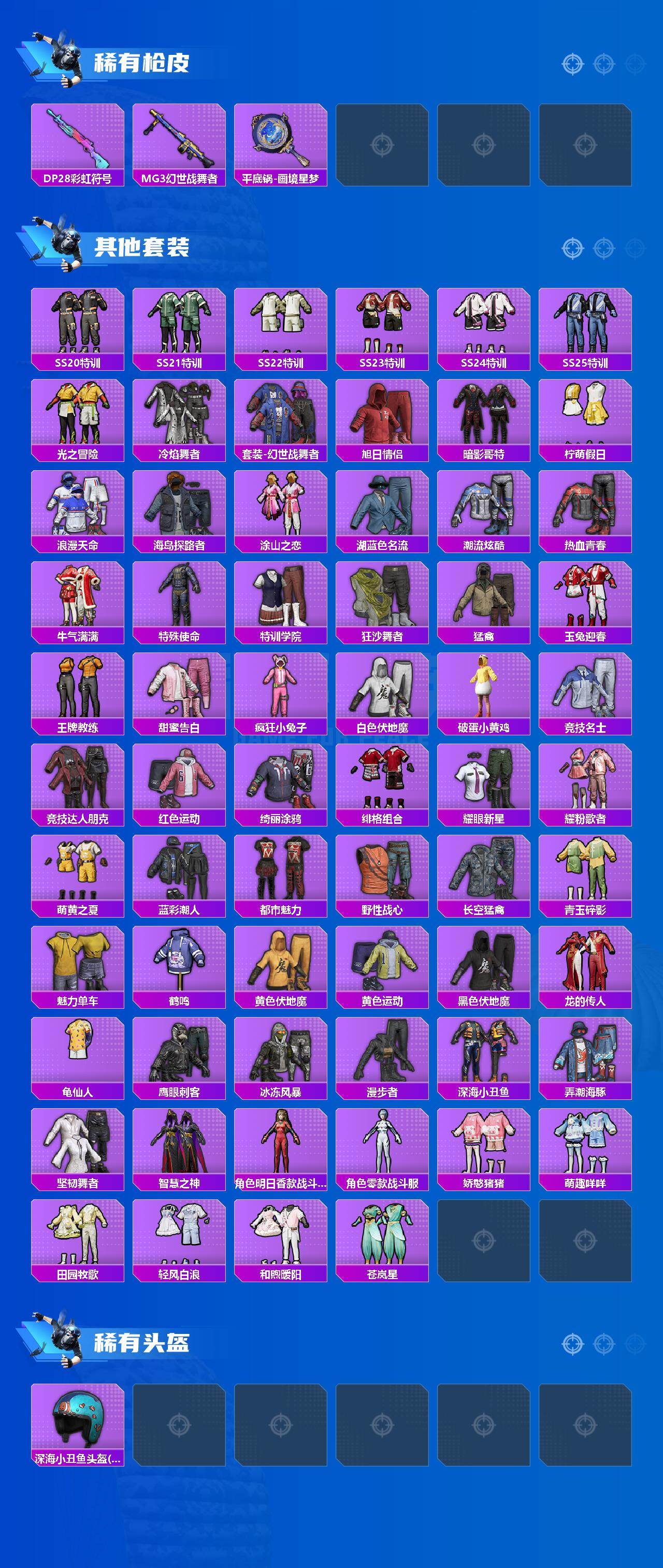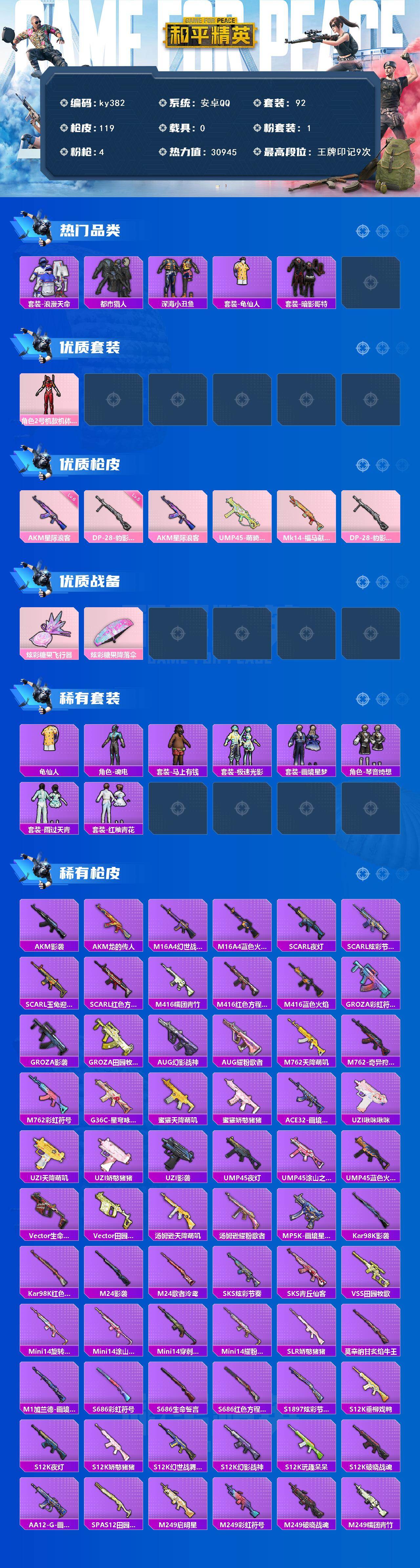 [17085844]安卓 手Q-1粉装-4特效枪-0载具-1粉色飞行器-30945热力值-9王牌印记-92套装-119枪皮 【热门品类】:套装-浪漫天命,套装-都市猎人,套装-深海小丑鱼,套装-龟仙人,套装-暗影哥特 【粉色套装】:角色-2号机款机体服 【粉色枪皮等级】:AKM-星际浪客(六级),DP-28-豹影疾电(五级) 【粉色枪皮】:AKM-星际浪客,UMP45-萌骑冒险,Mk14-福马献瑞,DP-28-豹影疾电 【粉色飞行器】:炫彩糖果飞行器 【粉色降落伞】:炫彩糖果降落伞 【稀有套装】:套装-龟仙人,套装-雪国风尚,套装-炫彩糖果,角色-魂电,套装-马上有钱,套装-极速光影,套装-画境星梦,套装-琴音绮想,套装-雨过天青,套装-红釉青花 【稀有枪皮】:AUG-冰晶雪宝,AKM-影袭,AKM-龙的传人,M16A4-幻世战舞者,M16A4-蓝色火焰,SCAR-L-夜灯,SCAR-L-炫彩节奏,SCAR-L-玉兔迎春,SCAR-L-红色方程式,M416-糯团青竹,M416-红色方程式,M416-蓝色火焰,GROZA-彩虹符号,GROZA-影袭,GROZA-田园牧歌,AUG-幻影战神,AUG-耀粉歌者,M762-天降萌叽,M762-奇异狩猎者,M762-彩虹符号,G36C-星穹咏叹调,蜜獾-天降萌叽,蜜獾-娇憨猪猪,ACE32-画境星梦,UZI-啾咪啾咪,UZI-天降萌叽,UZI-娇憨猪猪,UZI-影袭,UMP45-夜灯,UMP45-涂山之恋,UMP45-蓝色火焰,Vector-生命誓言,Vector-田园牧歌,汤姆逊-天降萌叽,汤姆逊-耀粉歌者,MP5K-画境星梦,Kar98K-影袭,Kar98K-红色方程式,M24-影袭,M24-歌者泠鸢,SKS-炫彩节奏,SKS-青丘仙客,VSS-田园牧歌,Mini14-旋转彩虹,Mini14-涂山之恋,Mini14-穿刺龙虾,Mini14-耀粉歌者,SLR-娇憨猪猪,莫辛纳甘-炙焰牛王,M1加兰德-画境星梦,S686-彩虹符号,S686-生命誓言,S686-红色方程式,S1897-炫彩节奏,S12K-玩趣呆呆,S12K-破晓战魂,S12K-垂柳戏鸭,S12K-夜灯,S12K-娇憨猪猪,S12K-幻世战舞者,S12K-幻影战神,AA12-G-画境星梦,SPAS-12-田园牧歌,M249-启明星,M249-彩虹符号,M249-破晓战魂,M249