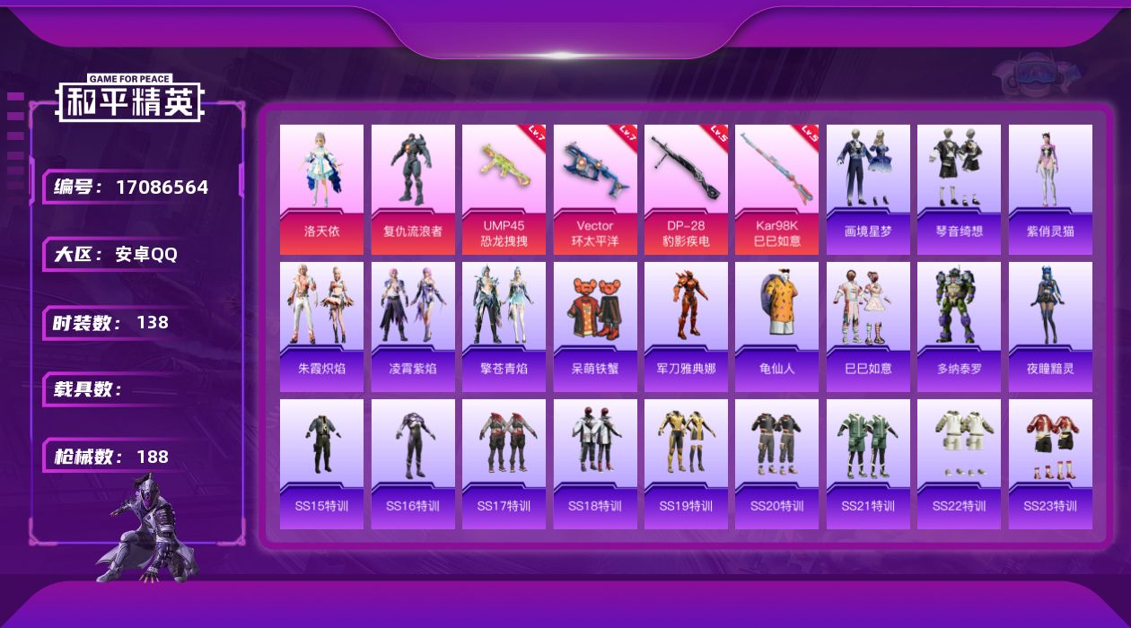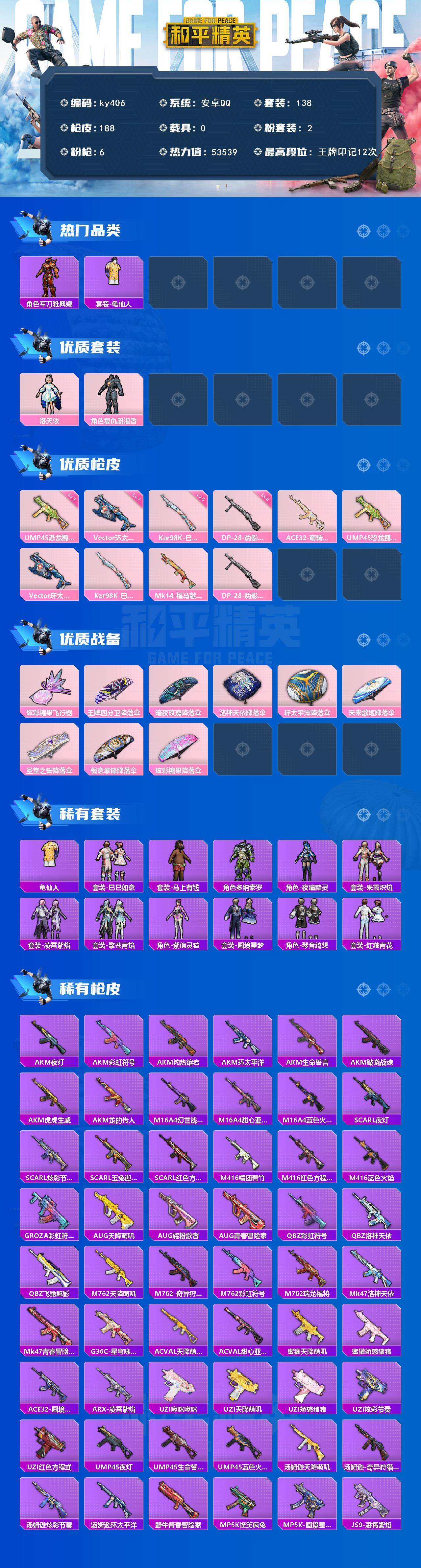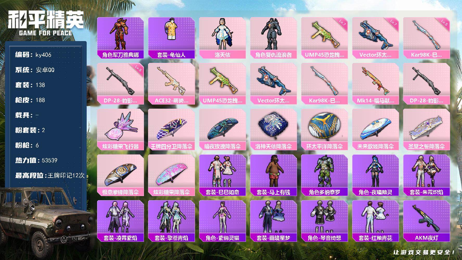 [17086564]安卓 手Q-2粉装-6特效枪-0载具-1粉色飞行器-53539热力值-12王牌印记-138套装-188枪皮 【热门品类】:角色-军刀雅典娜,套装-龟仙人 【粉色套装】:角色-洛天依,角色-复仇流浪者 【粉色枪皮等级】:UMP45-恐龙拽拽(七级),Vector-环太平洋(七级),Kar98K-巳巳如意(五级),DP-28-豹影疾电(五级) 【粉色枪皮】:ACE32-萌骑漫游,UMP45-恐龙拽拽,Vector-环太平洋,Kar98K-巳巳如意,Mk14-福马献瑞,DP-28-豹影疾电 【粉色飞行器】:炫彩糖果飞行器 【粉色降落伞】:王牌四分卫降落伞,暗夜玫瑰降落伞,洛神天依降落伞,环太平洋降落伞,未来歌姬降落伞,圣堂之誓降落伞,极意拳锋降落伞,炫彩糖果降落伞 【稀有套装】:套装-龟仙人,套装-巳巳如意,套装-雪国风尚,套装-炫彩糖果,套装-马上有钱,角色-多纳泰罗,角色-夜瞳黯灵,套装-朱霞炽焰,套装-凌霄紫焰,套装-擎苍青焰,角色-紫俏灵猫,套装-画境星梦,套装-琴音绮想,套装-红釉青花 【稀有枪皮】:AUG-冰晶雪宝,AKM-夜灯,AKM-彩虹符号,AKM-灼热熔岩,AKM-环太平洋,AKM-生命誓言,AKM-破晓战魂,AKM-虎虎生威,AKM-龙的传人,M16A4-幻世战舞者,M16A4-甜心亚梦,M16A4-蓝色火焰,SCAR-L-夜灯,SCAR-L-炫彩节奏,SCAR-L-玉兔迎春,SCAR-L-红色方程式,M416-糯团青竹,M416-红色方程式,M416-蓝色火焰,GROZA-彩虹符号,AUG-天降萌叽,AUG-耀粉歌者,AUG-青春冒险家,QBZ-彩虹符号,QBZ-洛神天依,QBZ-飞驰魅影,M762-天降萌叽,M762-奇异狩猎者,M762-彩虹符号,M762-瑞龙福将,Mk47-洛神天依,Mk47-青春冒险家,G36C-星穹咏叹调,AC-VAL-天降萌叽,AC-VAL-甜心亚梦,蜜獾-天降萌叽,蜜獾-娇憨猪猪,ACE32-画境星梦,ARX-凌霄紫焰,UZI-啾咪啾咪,UZI-天降萌叽,UZI-娇憨猪猪,UZI-炫彩节奏,UZI-红色方程式,UMP45-夜灯,UMP45-生命誓言,UMP45-蓝色火焰,汤姆逊-天降萌叽,汤姆逊-奇异狩猎者,汤姆逊-炫彩节奏,汤姆逊-环太平洋,野牛-青春冒险家,MP5K-怪笑疯兔,MP5K-画境星梦,JS9-凌霄紫