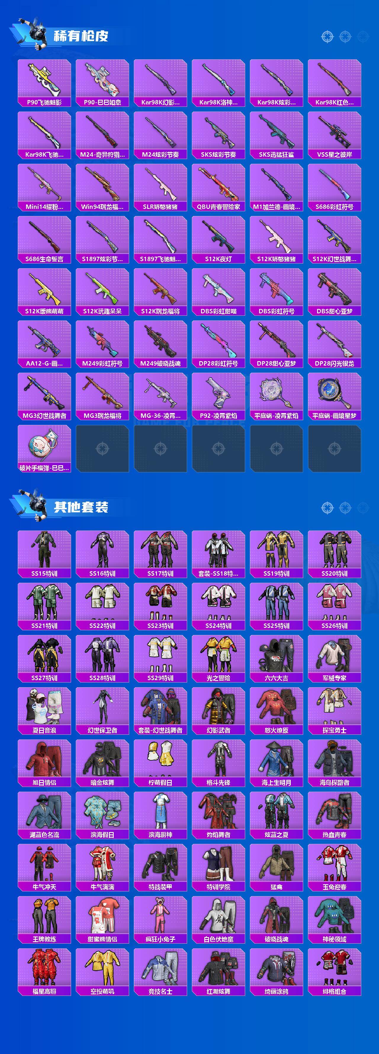 【稀有枪皮】:AUG-冰晶雪宝,AKM-夜灯,AKM-彩虹符号,AKM-灼热熔岩,AKM-环太平洋,AKM-生命誓言,AKM-破晓战魂,AKM-虎虎生威,AKM-龙的传人,M16A4-幻世战舞者,M16A4-甜心亚梦,M16A4-蓝色火焰,SCAR-L-夜灯,SCAR-L-炫彩节奏,SCAR-L-玉兔迎春,SCAR-L-红色方程式,M416-糯团青竹,M416-红色方程式,M416-蓝色火焰,GROZA-彩虹符号,AUG-天降萌叽,AUG-耀粉歌者,AUG-青春冒险家,QBZ-彩虹符号,QBZ-洛神天依,QBZ-飞驰魅影,M762-天降萌叽,M762-奇异狩猎者,M762-彩虹符号,M762-瑞龙福将,Mk47-洛神天依,Mk47-青春冒险家,G36C-星穹咏叹调,AC-VAL-天降萌叽,AC-VAL-甜心亚梦,蜜獾-天降萌叽,蜜獾-娇憨猪猪,ACE32-画境星梦,ARX-凌霄紫焰,UZI-啾咪啾咪,UZI-天降萌叽,UZI-娇憨猪猪,UZI-炫彩节奏,UZI-红色方程式,UMP45-夜灯,UMP45-生命誓言,UMP45-蓝色火焰,汤姆逊-天降萌叽,汤姆逊-奇异狩猎者,汤姆逊-炫彩节奏,汤姆逊-环太平洋,野牛-青春冒险家,MP5K-怪笑疯兔,MP5K-画境星梦,JS9-凌霄紫