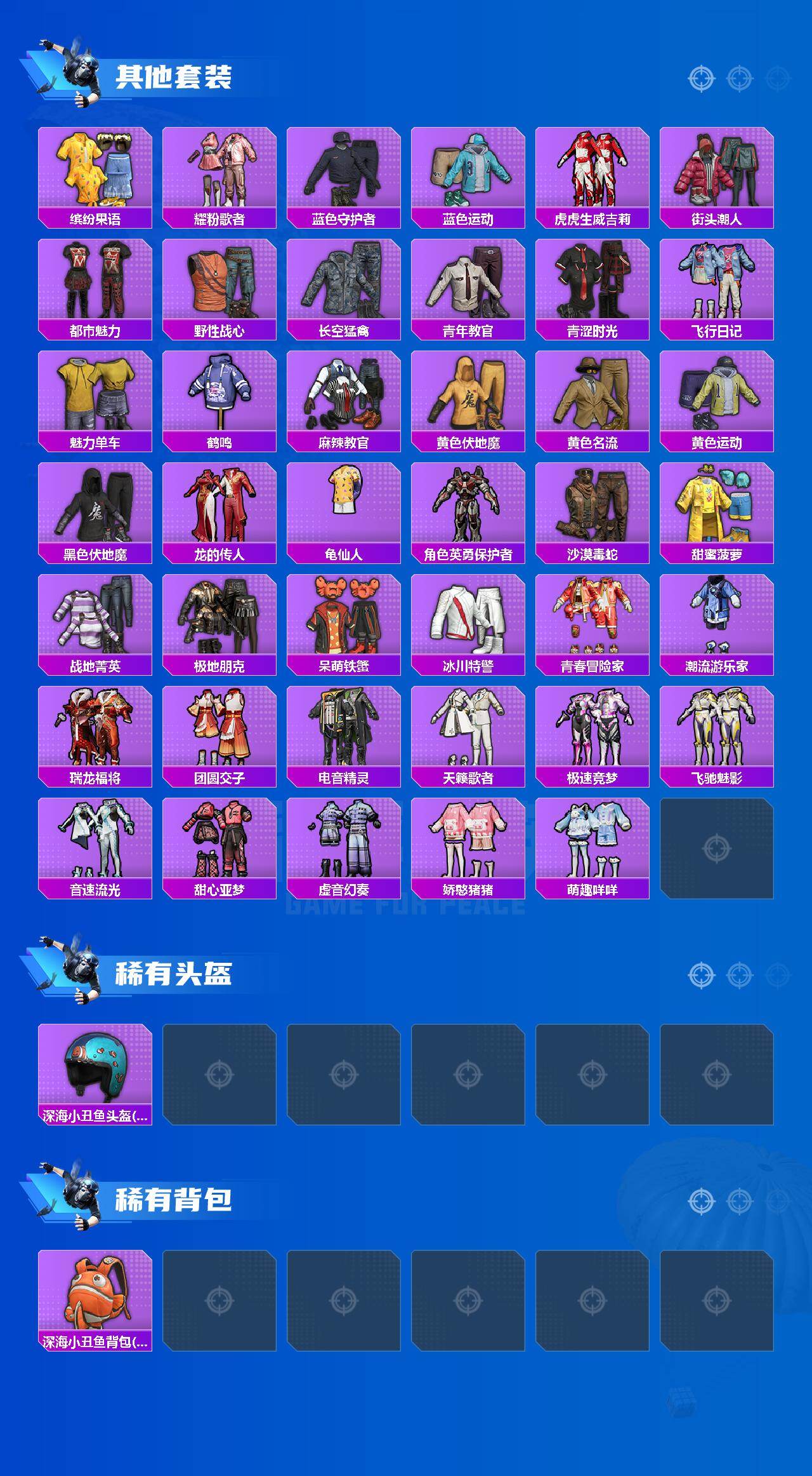 【稀有套装】:套装-龟仙人,套装-巳巳如意,套装-雪国风尚,套装-炫彩糖果,套装-马上有钱,角色-多纳泰罗,角色-夜瞳黯灵,套装-朱霞炽焰,套装-凌霄紫焰,套装-擎苍青焰,角色-紫俏灵猫,套装-画境星梦,套装-琴音绮想,套装-红釉青花