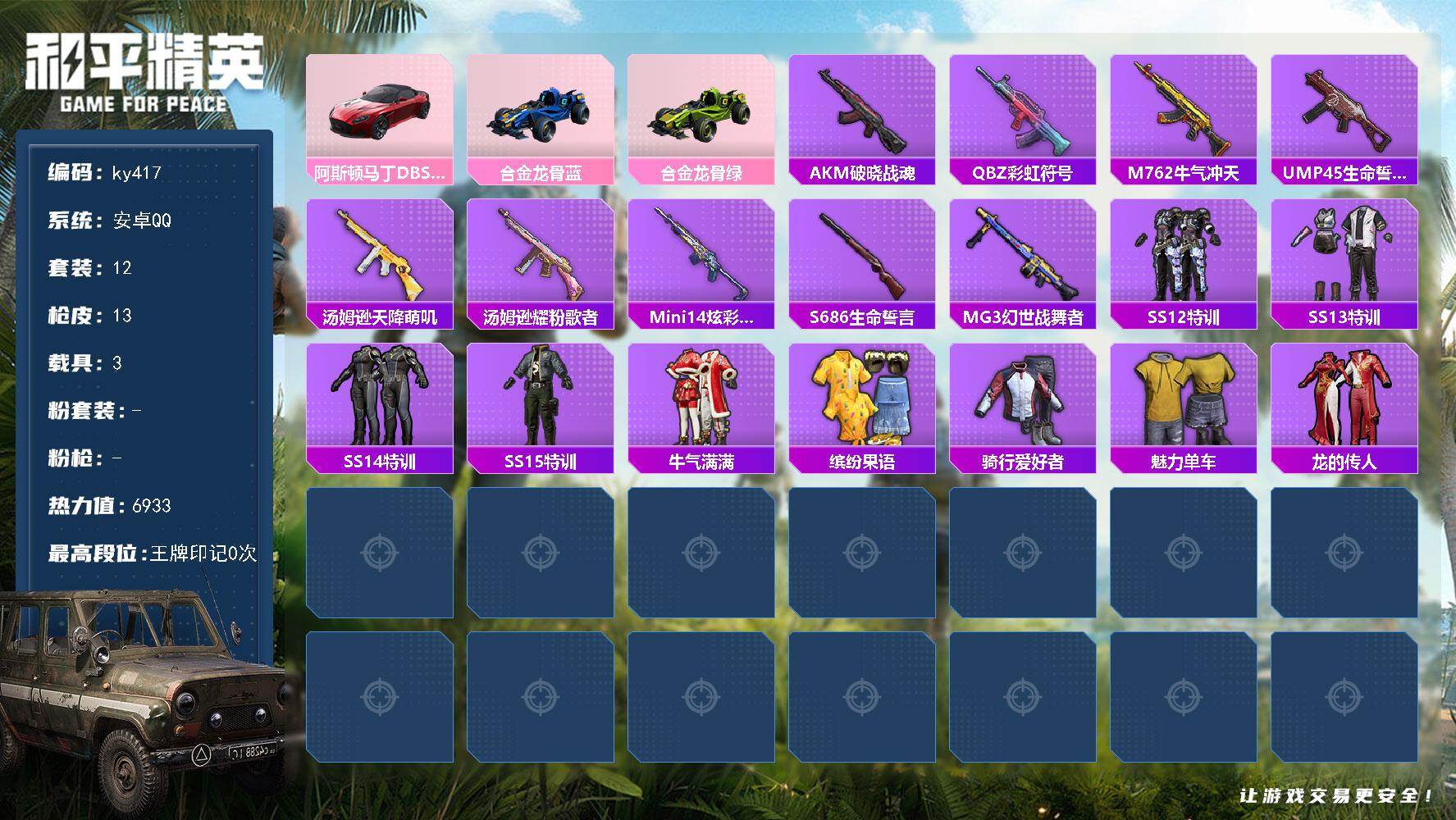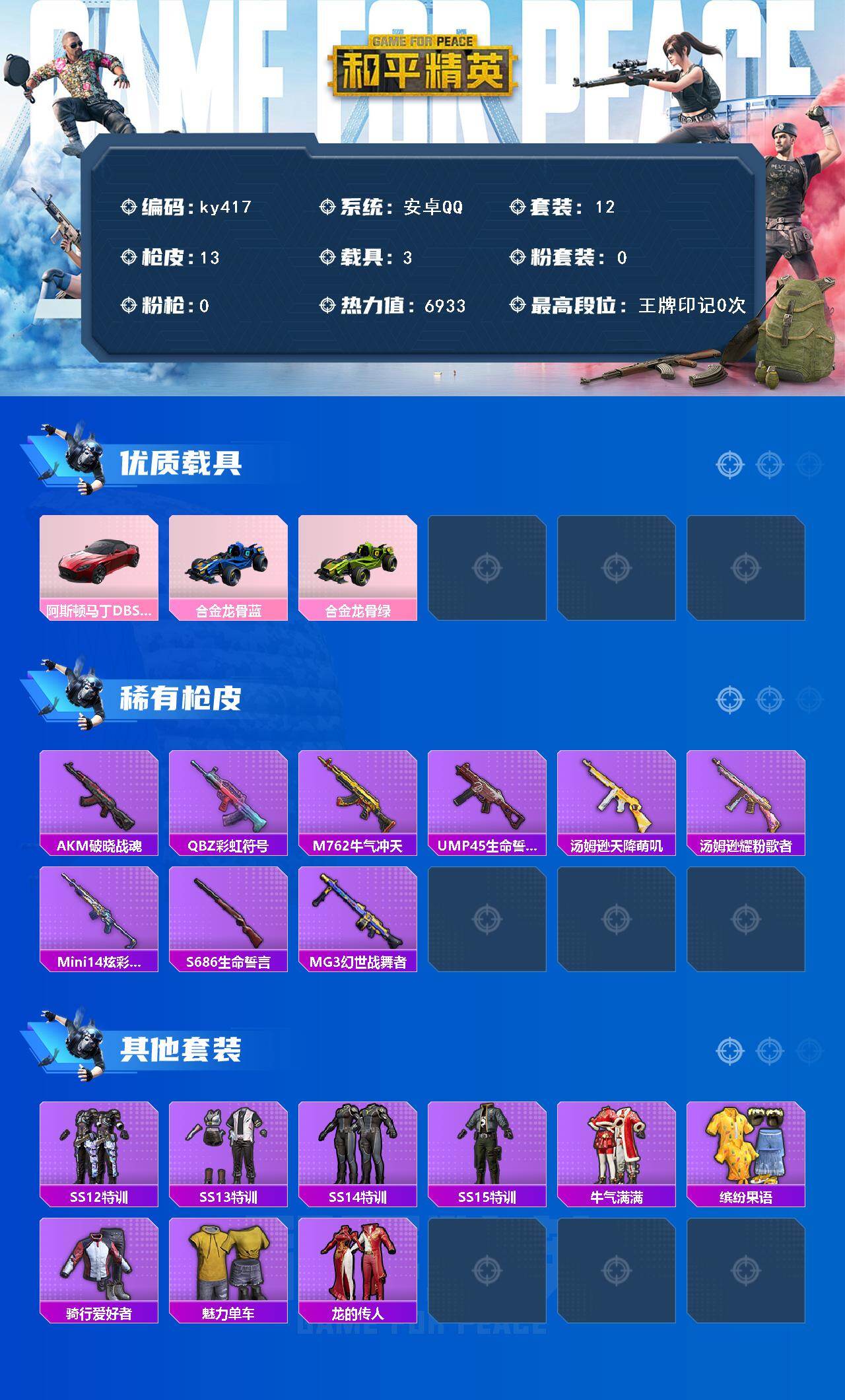 [17086816]安卓 手Q-0粉装-0特效枪-3载具-0粉色飞行器-6933热力值-2王牌印记-12套装-13枪皮 【粉色载具】:阿斯顿马丁DBS(红),合金龙骨(蓝),合金龙骨(绿) 【稀有枪皮】:AKM-破晓战魂,QBZ-彩虹符号,M762-牛气冲天,UMP45-生命誓言,汤姆逊-天降萌叽,汤姆逊-耀粉歌者,Mini14-炫彩节奏,S686-生命誓言,MG3-幻世战舞者 【其他套装】:套装-SS12特训,套装-SS13特训,套装-SS14特训,套装-SS15特训,套装-牛气满满,套装-缤纷果语,套装-骑行爱好者,套装-魅力单车,套装-龙的传人 【营地ID】:1046716281