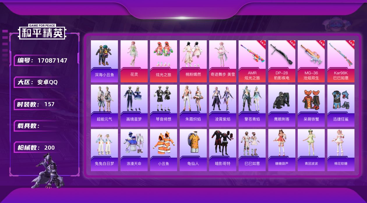[17087147]安卓 手Q-4粉装-7特效枪-0载具-2粉色飞行器-55188热力值-14王牌印记-157套装-200枪皮
