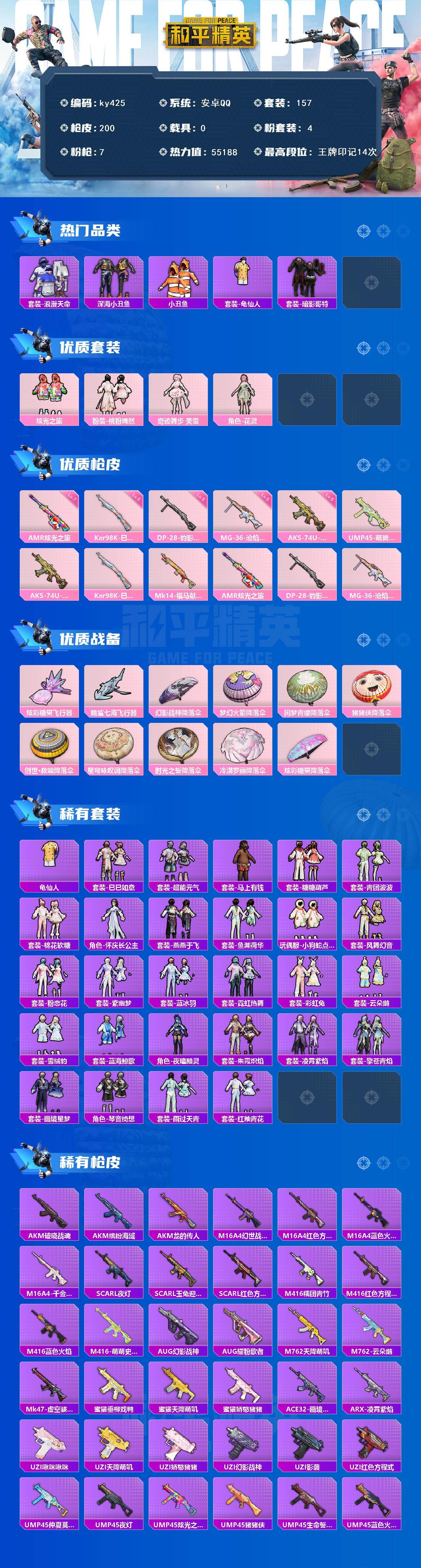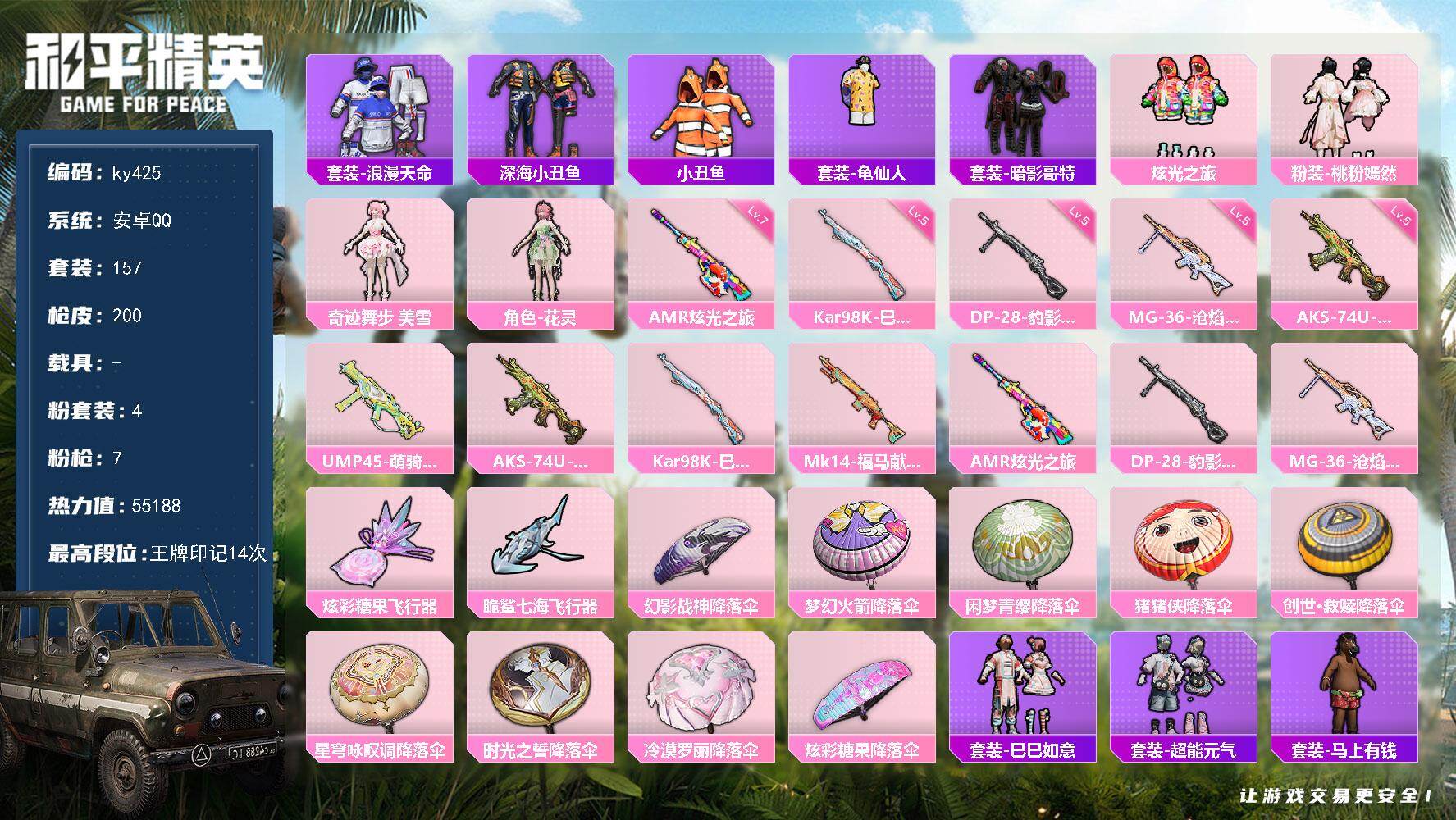 [17087147]安卓 手Q-4粉装-7特效枪-0载具-2粉色飞行器-55188热力值-14王牌印记-157套装-200枪皮 【热门品类】:套装-浪漫天命,套装-深海小丑鱼,套装-小丑鱼,套装-龟仙人,套装-暗影哥特 【粉色套装】:粉装-炫光之旅,粉装-桃粉嫣然,角色-奇迹舞步 美雪,角色-花灵 【粉色枪皮等级】:AKS-74U-森灵之息(五级),Kar98K-巳巳如意(五级),AMR-炫光之旅(七级),DP-28-豹影疾电(五级),MG-36-沧焰双生(五级) 【粉色枪皮】:UMP45-萌骑冒险,AKS-74U-森灵之息,Kar98K-巳巳如意,Mk14-福马献瑞,AMR-炫光之旅,DP-28-豹影疾电,MG-36-沧焰双生 【粉色飞行器】:炫彩糖果飞行器,脆鲨七海飞行器 【粉色降落伞】:幻影战神降落伞,梦幻火箭降落伞,闲梦青缨降落伞,猪猪侠降落伞,创世·救赎降落伞,星穹咏叹调降落伞,时光之誓降落伞,冷漠罗丽降落伞,炫彩糖果降落伞 【稀有套装】:套装-龟仙人,套装-巳巳如意,套装-超能元气,套装-雪国风尚,套装-炫彩糖果,套装-马上有钱,套装-糖糖葫芦,套装-青团波波,套装-棉花软糖,角色-怀庆长公主,套装-燕燕于飞,套装-鱼渊荷华,玩偶服-小狗蛇点点,套装-风舞幻音,套装-粉恋花,套装-紫幽梦,套装-蓝冰羽,套装-霓虹热舞,套装-彩虹兔,套装-云朵鹅,套装-雪绒豹,套装-蓝海鲸歌,角色-夜瞳黯灵,套装-朱霞炽焰,套装-凌霄紫焰,套装-擎苍青焰,套装-画境星梦,套装-琴音绮想,套装-雨过天青,套装-红釉青花 【稀有枪皮】:AKM-破晓战魂,AKM-缤纷海域,AKM-龙的传人,M16A4-幻世战舞者,M16A4-红色方程式,M16A4-蓝色火焰,M16A4-千金淑猫,SCAR-L-夜灯,SCAR-L-玉兔迎春,SCAR-L-红色方程式,M416-糯团青竹,M416-红色方程式,M416-蓝色火焰,M416-萌萌史莱姆,AUG-幻影战神,AUG-耀粉歌者,M762-天降萌叽,M762-云朵鹅,Mk47-虚空骇客,蜜獾-垂柳戏鸭,蜜獾-天降萌叽,蜜獾-娇憨猪猪,ACE32-画境星梦,ARX-凌霄紫焰,UZI-啾咪啾咪,UZI-天降萌叽,UZI-娇憨猪猪,UZI-幻影战神,UZI-影袭,UZI-红色方程式,UMP45-仲夏莫吉托,UMP45-夜灯,UMP45-炫光之旅,UMP45-猪猪侠