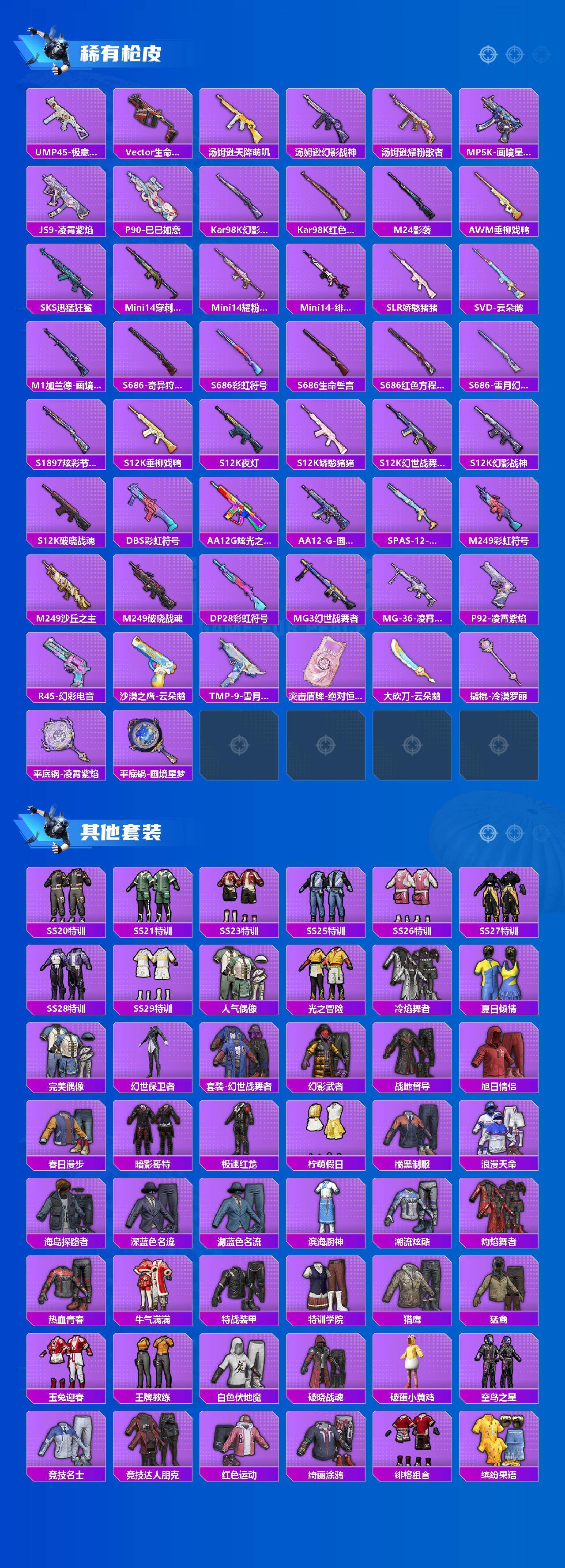 【稀有枪皮】:AKM-破晓战魂,AKM-缤纷海域,AKM-龙的传人,M16A4-幻世战舞者,M16A4-红色方程式,M16A4-蓝色火焰,M16A4-千金淑猫,SCAR-L-夜灯,SCAR-L-玉兔迎春,SCAR-L-红色方程式,M416-糯团青竹,M416-红色方程式,M416-蓝色火焰,M416-萌萌史莱姆,AUG-幻影战神,AUG-耀粉歌者,M762-天降萌叽,M762-云朵鹅,Mk47-虚空骇客,蜜獾-垂柳戏鸭,蜜獾-天降萌叽,蜜獾-娇憨猪猪,ACE32-画境星梦,ARX-凌霄紫焰,UZI-啾咪啾咪,UZI-天降萌叽,UZI-娇憨猪猪,UZI-幻影战神,UZI-影袭,UZI-红色方程式,UMP45-仲夏莫吉托,UMP45-夜灯,UMP45-炫光之旅,UMP45-猪猪侠