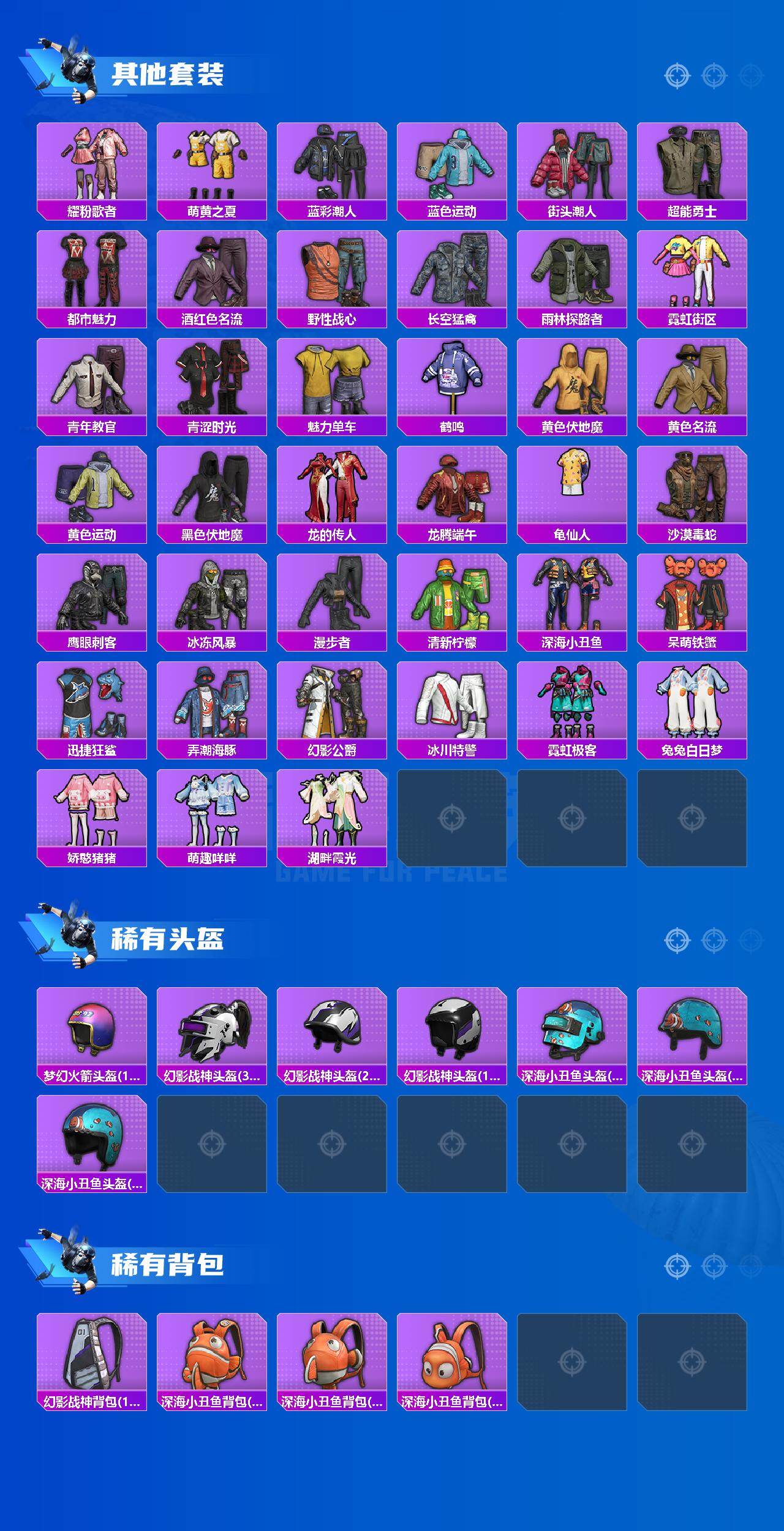 - PX_1980590-实名: 可修改 时装数: 702 载具数: 3 枪械数: 243 战备数: 153 热门装扮: 奇异狩猎者,梦幻火箭(新101),深海小丑鱼,梦魇先生,万圣娃娃,爱崽白熊,炙焰红王,冰霜白皇,童趣迷兔,蓝莓炮弹,筑梦精灵,紫电风暴,赤焰黑爵,闪耀律动,复仇流浪者,潮萌小黄鸭,软萌银虎,兔兔白日梦,仲夏莫吉托,炫光之旅 载具: 路特斯ELETRE(冰川蓝),玛莎拉蒂Quattr