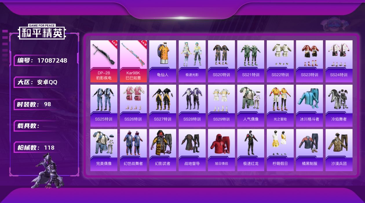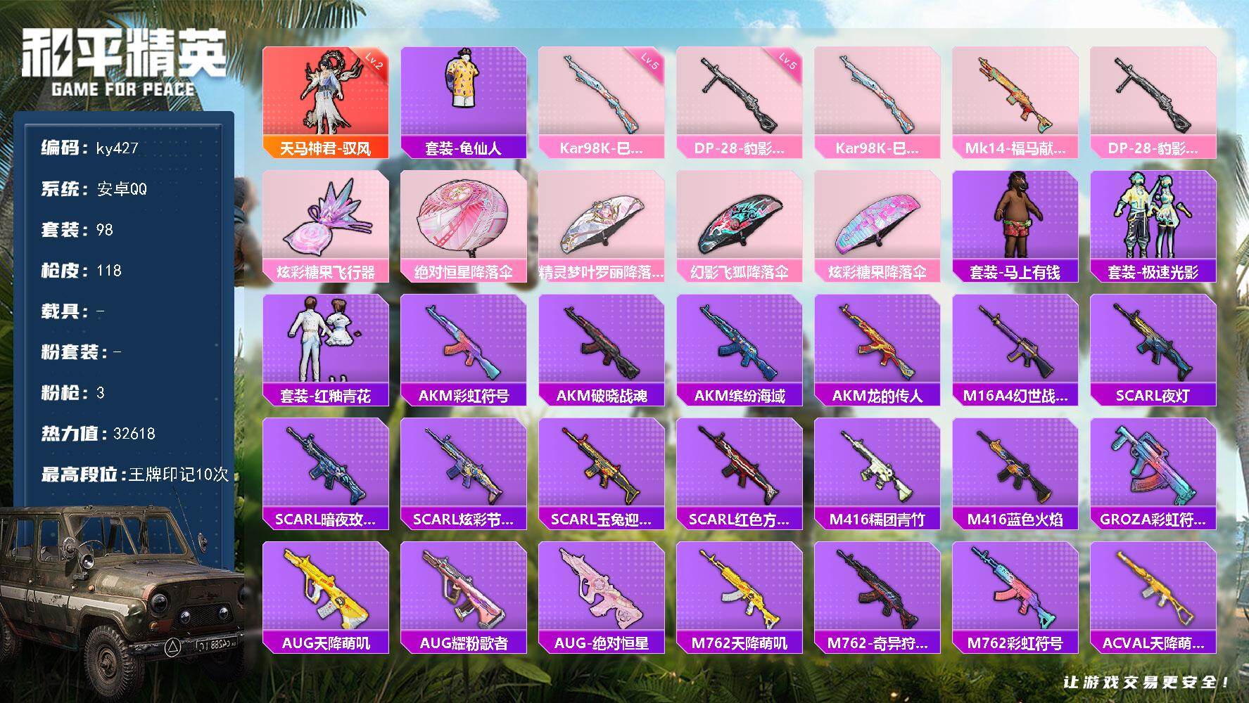 [17087248]安卓 手Q-1神装-0粉装-3特效枪-0载具-1粉色飞行器-32618热力值-10王牌印记-98套装-118枪皮