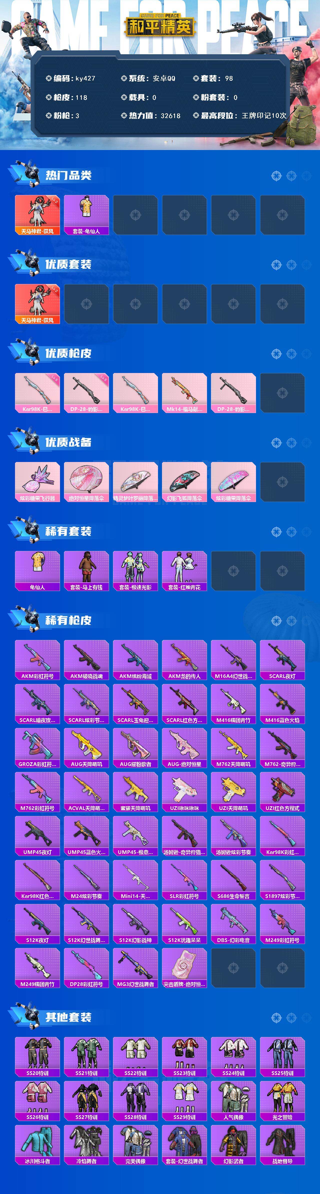 [17087248]安卓 手Q-1神装-0粉装-3特效枪-0载具-1粉色飞行器-32618热力值-10王牌印记-98套装-118枪皮 【红色神装等级】:天马神君-驭风(二级) 【红色角色神装】:天马神君-驭风 【热门品类】:套装-龟仙人 【粉色枪皮等级】:Kar98K-巳巳如意(五级),DP-28-豹影疾电(五级) 【粉色枪皮】:Kar98K-巳巳如意,Mk14-福马献瑞,DP-28-豹影疾电 【粉色飞行器】:炫彩糖果飞行器 【粉色降落伞】:绝对恒星降落伞,精灵梦叶罗丽降落伞,幻影飞狐降落伞,炫彩糖果降落伞 【稀有套装】:套装-龟仙人,套装-雪国风尚,套装-炫彩糖果,套装-马上有钱,套装-极速光影,套装-红釉青花 【稀有枪皮】:AUG-冰晶雪宝,AKM-彩虹符号,AKM-破晓战魂,AKM-缤纷海域,AKM-龙的传人,M16A4-幻世战舞者,SCAR-L-夜灯,SCAR-L-暗夜玫瑰,SCAR-L-炫彩节奏,SCAR-L-玉兔迎春,SCAR-L-红色方程式,M416-糯团青竹,M416-蓝色火焰,GROZA-彩虹符号,AUG-天降萌叽,AUG-耀粉歌者,AUG-绝对恒星,M762-天降萌叽,M762-奇异狩猎者,M762-彩虹符号,AC-VAL-天降萌叽,蜜獾-天降萌叽,UZI-啾咪啾咪,UZI-天降萌叽,UZI-红色方程式,UMP45-夜灯,UMP45-蓝色火焰,UMP45-极意拳锋,汤姆逊-奇异狩猎者,汤姆逊-炫彩节奏,Kar98K-彩虹符号,Kar98K-红色方程式,M24-炫彩节奏,Mini14-天马神君,SLR-彩虹符号,S686-生命誓言,S1897-炫彩节奏,S12K-玩趣呆呆,S12K-夜灯,S12K-幻世战舞者,S12K-幻影战神,DBS-幻彩电音,M249-彩虹符号,M249-糯团青竹,DP-28-彩虹符号,MG3-幻世战舞者,突击盾牌-绝对恒星 【其他套装】:套装-SS20特训,套装-SS21特训,套装-SS22特训,套装-SS23特训,套装-SS24特训,套装-SS25特训,套装-SS26特训,套装-SS27特训,套装-SS28特训,套装-SS29特训,套装-人气偶像,套装-光之冒险,套装-冰川格斗者,套装-冷焰舞者,套装-完美偶像,套装-幻世战舞者,套装-幻影武者,套装-战地督导,套装-旭日情侣,套装-极速红龙,套装-柠萌假日,套装-橘黑制服,套装-沙漠兵团,