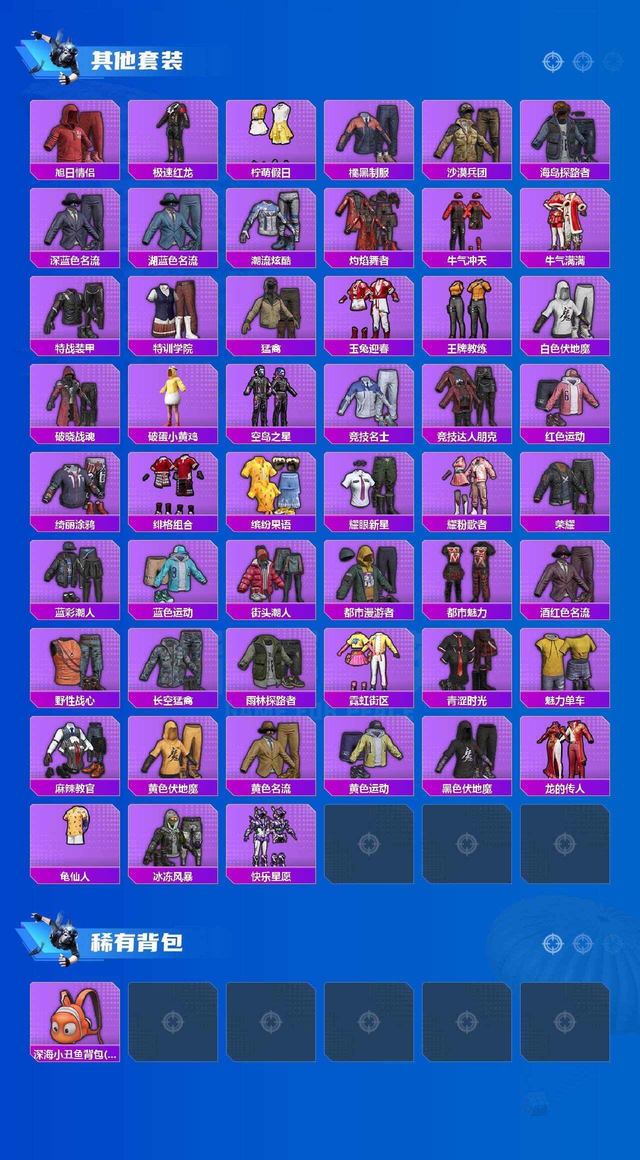 【其他套装】:套装-SS20特训,套装-SS21特训,套装-SS22特训,套装-SS23特训,套装-SS24特训,套装-SS25特训,套装-SS26特训,套装-SS27特训,套装-SS28特训,套装-SS29特训,套装-人气偶像,套装-光之冒险,套装-冰川格斗者,套装-冷焰舞者,套装-完美偶像,套装-幻世战舞者,套装-幻影武者,套装-战地督导,套装-旭日情侣,套装-极速红龙,套装-柠萌假日,套装-橘黑制服,套装-沙漠兵团,