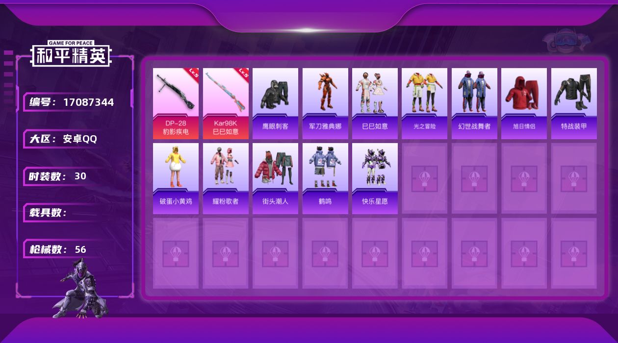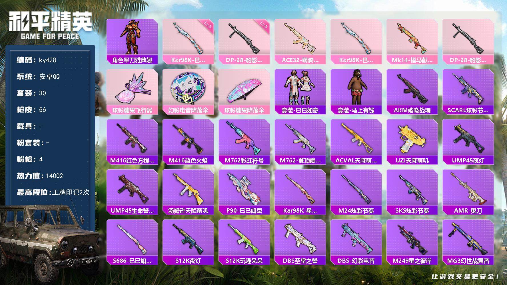 [17087344]安卓 手Q-0粉装-4特效枪-0载具-1粉色飞行器-14002热力值-2王牌印记-30套装-56枪皮