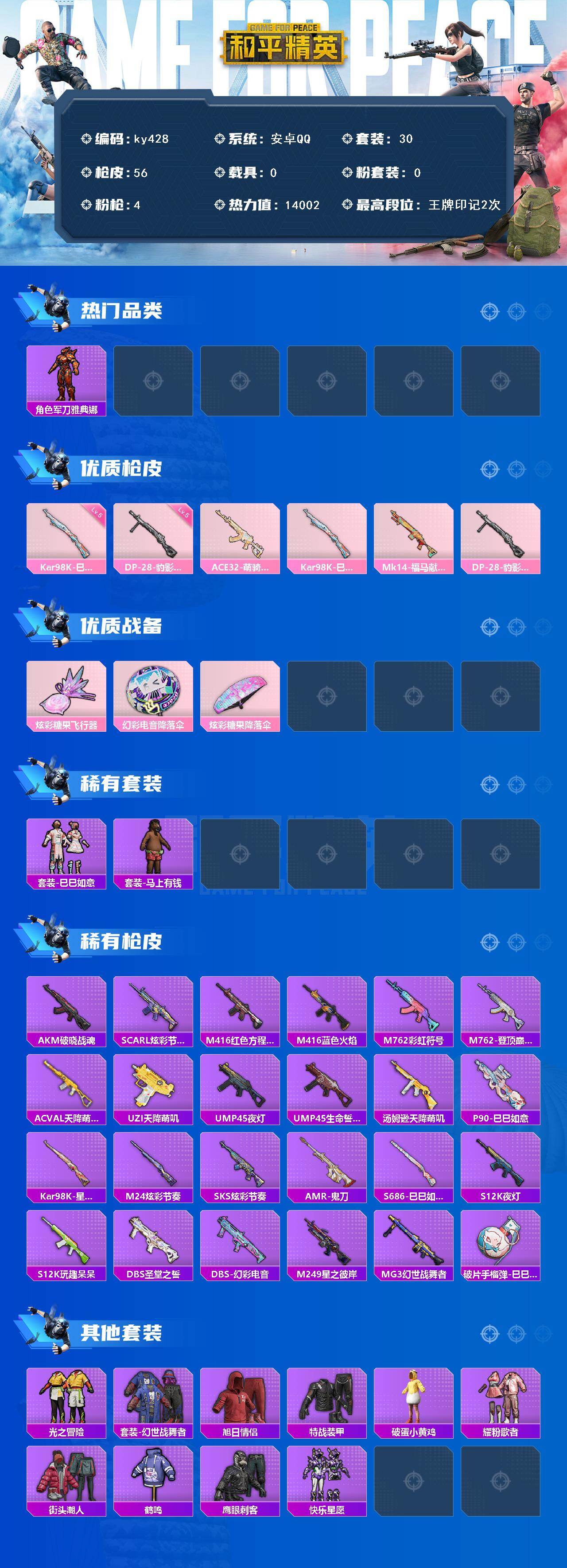 [17087344]安卓 手Q-0粉装-4特效枪-0载具-1粉色飞行器-14002热力值-2王牌印记-30套装-56枪皮 【热门品类】:角色-军刀雅典娜 【粉色枪皮等级】:Kar98K-巳巳如意(五级),DP-28-豹影疾电(五级) 【粉色枪皮】:ACE32-萌骑漫游,Kar98K-巳巳如意,Mk14-福马献瑞,DP-28-豹影疾电 【粉色飞行器】:炫彩糖果飞行器 【粉色降落伞】:幻彩电音降落伞,炫彩糖果降落伞 【稀有套装】:套装-巳巳如意,套装-雪国风尚,套装-炫彩糖果,套装-马上有钱 【稀有枪皮】:AUG-冰晶雪宝,AKM-破晓战魂,SCAR-L-炫彩节奏,M416-红色方程式,M416-蓝色火焰,M762-彩虹符号,M762-登顶巅峰,AC-VAL-天降萌叽,UZI-天降萌叽,UMP45-夜灯,UMP45-生命誓言,汤姆逊-天降萌叽,P90-巳巳如意,Kar98K-星穹咏叹调,M24-炫彩节奏,SKS-炫彩节奏,AMR-鬼刀,S686-巳巳如意,S12K-玩趣呆呆,S12K-夜灯,DBS-圣堂之誓,DBS-幻彩电音,M249-星之彼岸,MG3-幻世战舞者,破片手榴弹-巳巳如意 【其他套装】:套装-光之冒险,套装-幻世战舞者,套装-旭日情侣,套装-特战装甲,套装-破蛋小黄鸡,套装-耀粉歌者,套装-街头潮人,套装-鹤鸣,套装-鹰眼刺客,套装-快乐星愿 【营地ID】:1047363728
