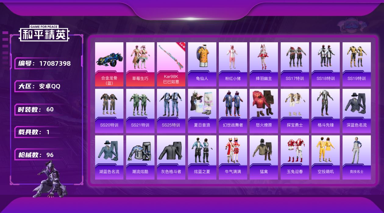 [17087398]安卓 手Q-1粉装-1特效枪-1载具-0粉色飞行器-26395热力值-3王牌印记-60套装-96枪皮