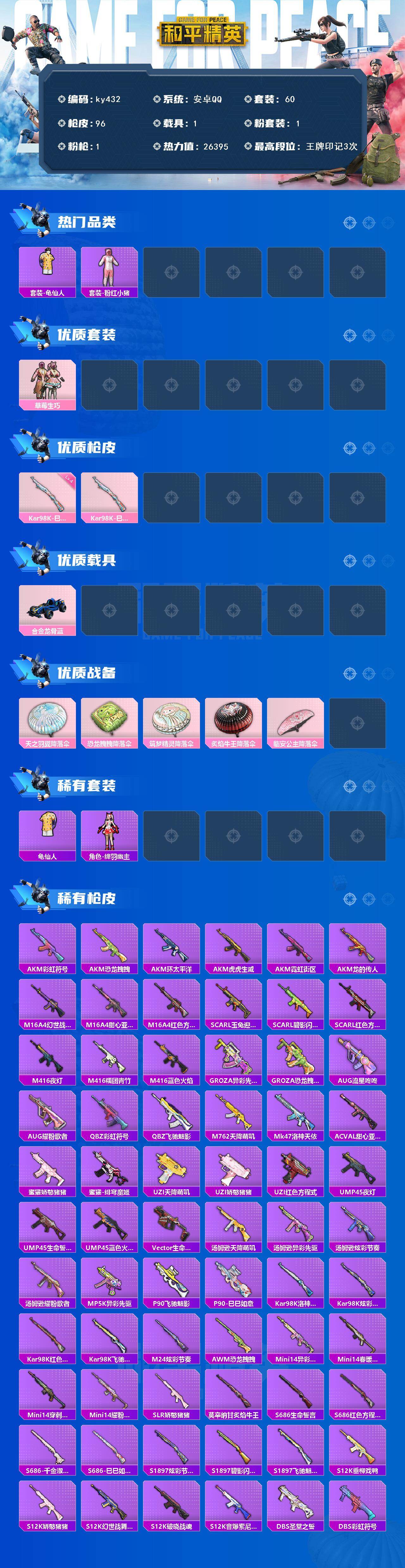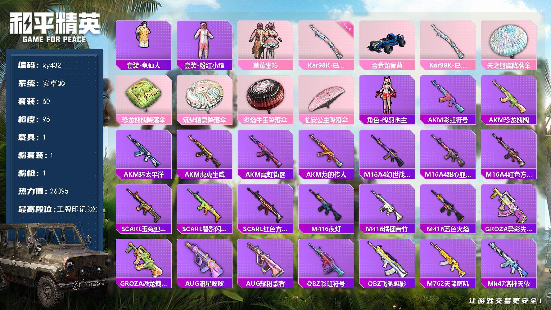 [17087398]安卓 手Q-1粉装-1特效枪-1载具-0粉色飞行器-26395热力值-3王牌印记-60套装-96枪皮 【热门品类】:套装-龟仙人,套装-粉红小猪 【粉色套装】:粉装-草莓生巧 【粉色枪皮等级】:Kar98K-巳巳如意(四级) 【粉色载具】:合金龙骨(蓝) 【粉色枪皮】:Kar98K-巳巳如意 【粉色降落伞】:天之羽翼降落伞,恐龙拽拽降落伞,筑梦精灵降落伞,炙焰牛王降落伞,临安公主降落伞 【稀有套装】:套装-龟仙人,角色-绛羽幽主 【稀有枪皮】:AKM-彩虹符号,AKM-恐龙拽拽,AKM-环太平洋,AKM-虎虎生威,AKM-霓虹街区,AKM-龙的传人,M16A4-幻世战舞者,M16A4-甜心亚梦,M16A4-红色方程式,SCAR-L-玉兔迎春,SCAR-L-碧影闪光,SCAR-L-红色方程式,M416-夜灯,M416-糯团青竹,M416-蓝色火焰,GROZA-异彩先驱,GROZA-恐龙拽拽,AUG-流星咚咚,AUG-耀粉歌者,QBZ-彩虹符号,QBZ-飞驰魅影,M762-天降萌叽,Mk47-洛神天依,AC-VAL-甜心亚梦,蜜獾-娇憨猪猪,蜜獾-绯穹魔姬,UZI-天降萌叽,UZI-娇憨猪猪,UZI-红色方程式,UMP45-夜灯,UMP45-生命誓言,UMP45-蓝色火焰,Vector-生命誓言,汤姆逊-天降萌叽,汤姆逊-异彩先驱,汤姆逊-炫彩节奏,汤姆逊-耀粉歌者,MP5K-异彩先驱,P90-飞驰魅影,P90-巳巳如意,Kar98K-洛神天依,Kar98K-炫彩节奏,Kar98K-红色方程式,Kar98K-飞驰魅影,M24-炫彩节奏,AWM-恐龙拽拽,Mini14-异彩先驱,Mini14-春暖花开,Mini14-穿刺龙虾,Mini14-耀粉歌者,SLR-娇憨猪猪,莫辛纳甘-炙焰牛王,S686-生命誓言,S686-红色方程式,S686-巳巳如意,S686-千金淑猫,S1897-炫彩节奏,S1897-碧影闪光,S1897-飞驰魅影,S12K-破晓战魂,S12K-音爆索尼克,S12K-垂柳戏鸭,S12K-娇憨猪猪,S12K-幻世战舞者,DBS-圣堂之誓,DBS-彩虹符号,DBS-甜心亚梦,M249-彩虹符号,M249-绯穹魔姬,DP-28-甜心亚梦,MG3-幻世战舞者,MG3-第五大道 【其他套装】:套装-SS17特训,套装-SS18特训,套装-SS19特训,套装-SS2