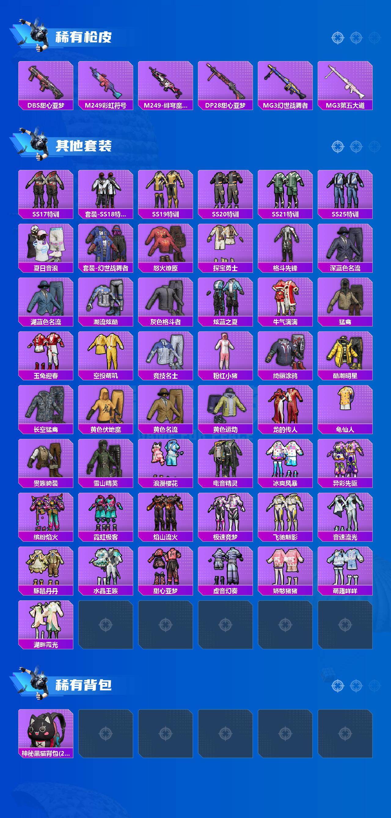 【稀有枪皮】:AKM-彩虹符号,AKM-恐龙拽拽,AKM-环太平洋,AKM-虎虎生威,AKM-霓虹街区,AKM-龙的传人,M16A4-幻世战舞者,M16A4-甜心亚梦,M16A4-红色方程式,SCAR-L-玉兔迎春,SCAR-L-碧影闪光,SCAR-L-红色方程式,M416-夜灯,M416-糯团青竹,M416-蓝色火焰,GROZA-异彩先驱,GROZA-恐龙拽拽,AUG-流星咚咚,AUG-耀粉歌者,QBZ-彩虹符号,QBZ-飞驰魅影,M762-天降萌叽,Mk47-洛神天依,AC-VAL-甜心亚梦,蜜獾-娇憨猪猪,蜜獾-绯穹魔姬,UZI-天降萌叽,UZI-娇憨猪猪,UZI-红色方程式,UMP45-夜灯,UMP45-生命誓言,UMP45-蓝色火焰,Vector-生命誓言,汤姆逊-天降萌叽,汤姆逊-异彩先驱,汤姆逊-炫彩节奏,汤姆逊-耀粉歌者,MP5K-异彩先驱,P90-飞驰魅影,P90-巳巳如意,Kar98K-洛神天依,Kar98K-炫彩节奏,Kar98K-红色方程式,Kar98K-飞驰魅影,M24-炫彩节奏,AWM-恐龙拽拽,Mini14-异彩先驱,Mini14-春暖花开,Mini14-穿刺龙虾,Mini14-耀粉歌者,SLR-娇憨猪猪,莫辛纳甘-炙焰牛王,S686-生命誓言,S686-红色方程式,S686-巳巳如意,S686-千金淑猫,S1897-炫彩节奏,S1897-碧影闪光,S1897-飞驰魅影,S12K-破晓战魂,S12K-音爆索尼克,S12K-垂柳戏鸭,S12K-娇憨猪猪,S12K-幻世战舞者,DBS-圣堂之誓,DBS-彩虹符号,DBS-甜心亚梦,M249-彩虹符号,M249-绯穹魔姬,DP-28-甜心亚梦,MG3-幻世战舞者,MG3-第五大道