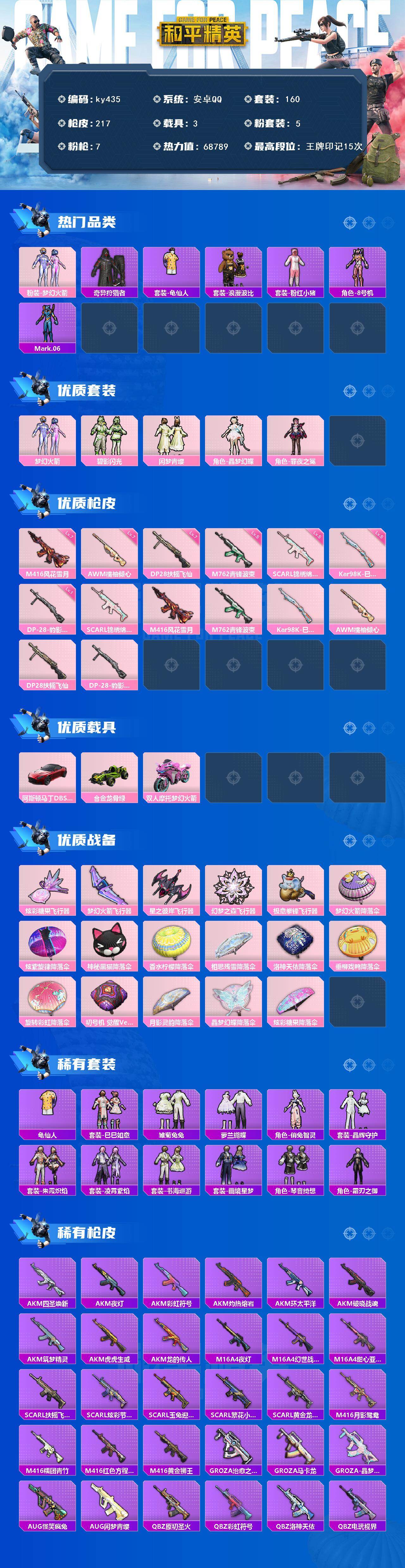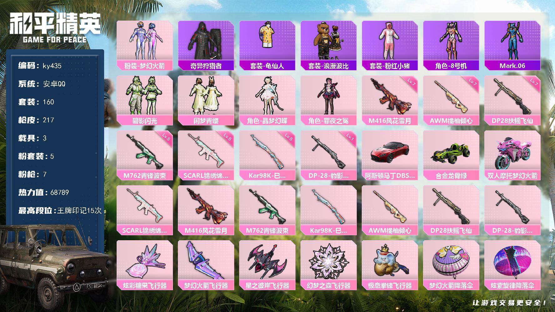 [17087630]安卓 手Q-5粉装-7特效枪-3载具-5粉色飞行器-68789热力值-15王牌印记-160套装-217枪皮