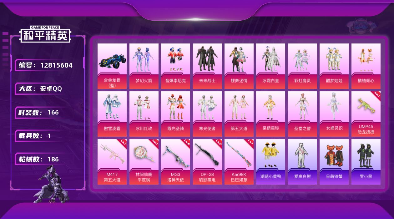 [12815604]【816】安卓 手Q-16粉装-6特效枪-1载具-4粉色飞行器-67356热力值-10王牌印记-166套装-186枪皮