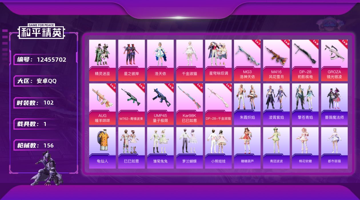 [12455702]【819】安卓 手Q-5粉装-9特效枪-1载具-0粉色飞行器-54469热力值-9王牌印记-102套装-156枪皮