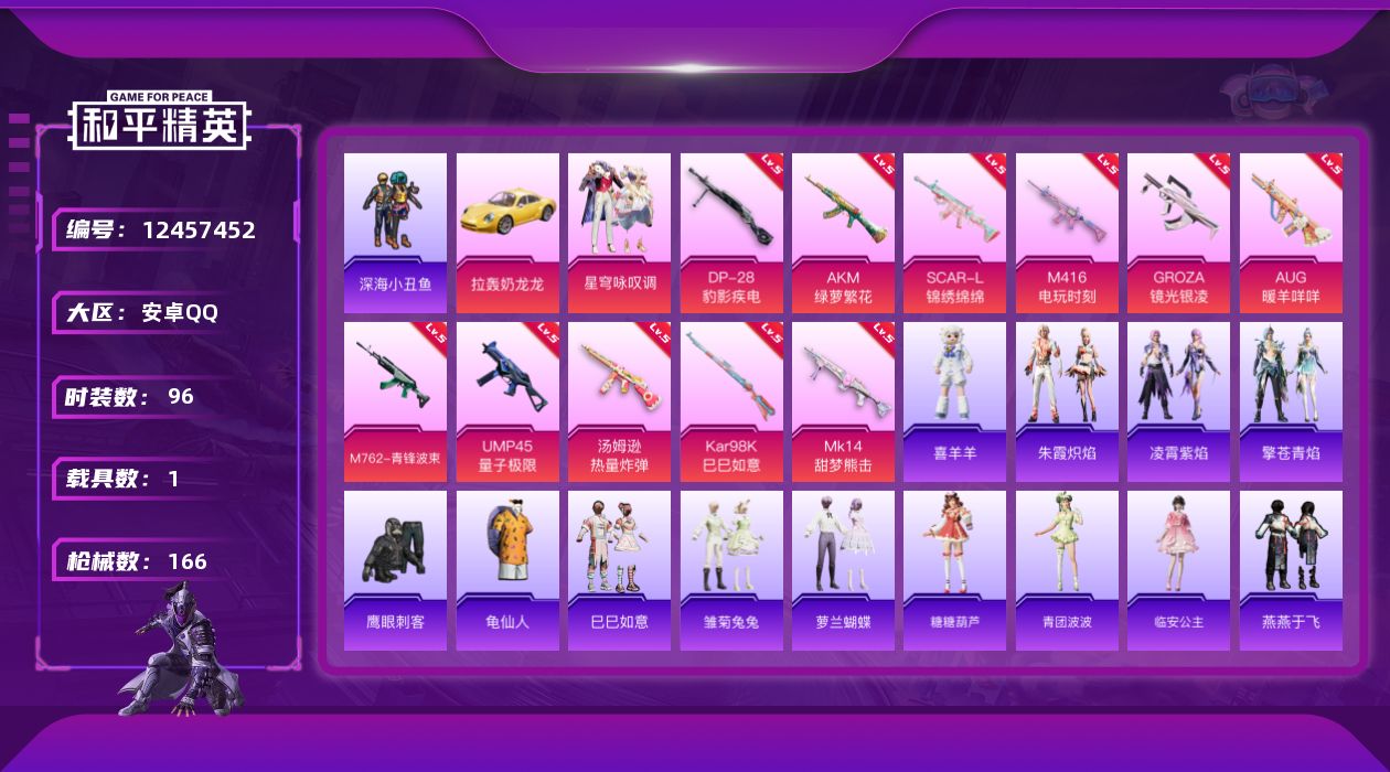 [12457452]【824】安卓 手Q-1粉装-11特效枪-1载具-0粉色飞行器-45634热力值-10王牌印记-96套装-166枪皮