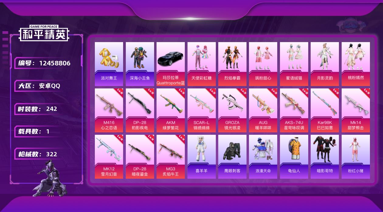 [12458806]【827】安卓 手Q-6粉装-12特效枪-1载具-2粉色飞行器-107661热力值-17王牌印记-242套装-322枪皮 【热门品类】:套装-浪漫天命,套装-派对舞王,套装-深海小丑鱼,套装-龟仙人,套装-暗影哥特,套装-粉红小猪,角色-Mark.06 【粉色载具】:玛莎拉蒂Quattroporte(夜幕蓝) 【粉色套装】:粉装-天使彩虹糖,粉装-烈焰拳霸,粉装-飒粉甜心,粉装-蜜语绒猫,角色-月影灵韵,粉装-桃粉嫣然 【粉色枪皮等级】:AKM-绿萝繁花(五级),SCAR-L-锦绣绵绵(五级),M416-心之恋语(六级),GROZA-镜光银凌(五级),AUG-暖羊咩咩(五级),AKS-74U-星穹咏叹调(五级),Kar98K-巳巳如意(五级),Mk14-甜梦熊击(五级),MK12-雪月幻音(四级),DP-28-暗夜鎏金(四级),DP-28-豹影疾电(五级),MG3-炙焰牛王(四级) 【粉色枪皮】:AKM-绿萝繁花,SCAR-L-锦绣绵绵,M416-心之恋语,GROZA-镜光银凌,AUG-暖羊咩咩,AKS-74U-星穹咏叹调,Kar98K-巳巳如意,Mk14-甜梦熊击,MK12-雪月幻音,DP-28-暗夜鎏金,DP-28-豹影疾电,MG3-炙焰牛王 【粉色飞行器】:太空嘟嘟飞行器,雀灵庇佑飞行器 【粉色降落伞】:神秘黑猫降落伞,阿狸红降落伞,暗夜玫瑰降落伞,齐天大圣降落伞,蓝莓炮弹降落伞,环太平洋降落伞,垂柳戏鸭降落伞,旋转彩虹降落伞,第五大道降落伞,闲梦青缨降落伞,猪猪侠降落伞,蜜语绒猫降落伞,临安公主降落伞,脆鲨七海降落伞,金蛇镇世降落伞,墨金战记降落伞,幻彩电音降落伞 【稀有套装】:套装-龟仙人,套装-巳巳如意,角色-米开朗基罗,套装-糖糖葫芦,套装-青团波波,套装-棉花软糖,角色-都市丽猫,套装-燕燕于飞,套装-鱼渊荷华,角色-风玲,套装-晶辉守护,套装-粉恋花,套装-紫幽梦,套装-蓝冰羽,套装-霓虹热舞,套装-彩虹兔,套装-云朵鹅,套装-雪绒豹,玩偶服-喜羊羊 【稀有枪皮】:AKM-墨染幽兰,AKM-夜灯,AKM-彩虹符号,AKM-影袭,AKM-灼热熔岩,AKM-环太平洋,AKM-生命誓言,AKM-破晓战魂,AKM-缤纷海域,AKM-萌趣颜团子,AKM-虎虎生威,AKM-霓虹街区,AKM-龙的传人,M16A4-凝视深渊,M16A4-幻世战舞者,M16A4-