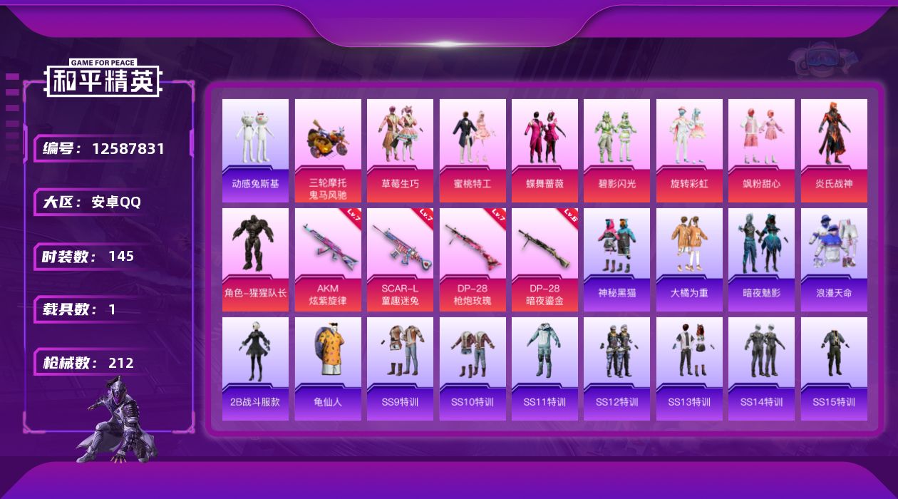 [12587831]【966】安卓 手Q-8粉装-4特效枪-1载具-1粉色飞行器-73110热力值-8王牌印记-145套装-212枪皮 【热门品类】:套装-浪漫天命,套装-动感兔斯基人偶服,角色-2B战斗服款,套装-龟仙人 【粉色载具】:鬼马风驰 【粉色套装】:粉装-草莓生巧,粉装-蜜桃特工,粉装-蝶舞蔷薇,粉装-碧影闪光,粉装-旋转彩虹,粉装-飒粉甜心,粉装-炎氏战神,角色-猩猩队长 【粉色枪皮等级】:AKM-炫紫旋律(七级),SCAR-L-童趣迷兔(七级),DP-28-枪炮玫瑰(七级),DP-28-暗夜鎏金(六级) 【粉色枪皮】:AKM-炫紫旋律,SCAR-L-童趣迷兔,DP-28-枪炮玫瑰,DP-28-暗夜鎏金 【粉色飞行器】:终极赛罗飞行器 【粉色降落伞】:深海曼妙降落伞,快乐主宰降落伞,潮汐统领降落伞,夏日绵绵冰降落伞,银刃赛罗降落伞,童趣迷兔降落伞,烈焰拳霸降落伞,枪炮玫瑰降落伞,林间仙鹿降落伞,蓝莓炮弹降落伞,妙趣可丽降落伞,旋转彩虹降落伞,音爆索尼克降落伞,未来歌姬降落伞,拂晓神骑降落伞 【稀有套装】:套装-龟仙人 【稀有枪皮】:AKM-夜灯,AKM-彩虹符号,AKM-恐龙拽拽,AKM-灼热熔岩,AKM-环太平洋,AKM-百万伏特,AKM-萌趣颜团子,AKM-虎虎生威,AKM-霓虹街区,AKM-龙的传人,M16A4-夜灯,M16A4-幻世战舞者,M16A4-机械英豪,M16A4-甜心亚梦,SCAR-L-夜灯,SCAR-L-炫彩节奏,SCAR-L-玉兔迎春,SCAR-L-甜蜜旋律,SCAR-L-青丘仙客,SCAR-L-龙宫之主,M416-夜灯,M416-神秘黑猫,M416-糯团青竹,GROZA-2B战斗服款,GROZA-异彩先驱,GROZA-彩虹符号,GROZA-懵萌河马,GROZA-治愈之星,GROZA-生命誓言,GROZA-田园牧歌,GROZA-马卡龙,AUG-流星咚咚,AUG-青春冒险家,QBZ-原初圣火,QBZ-妙趣可丽,QBZ-彩虹符号,QBZ-未来歌姬,QBZ-洛神天依,QBZ-电玩视界,QBZ-神秘黑猫,QBZ-赛罗,QBZ-飞驰魅影,M762-天降萌叽,M762-暗夜鎏金,M762-烈焰拳霸,M762-牛气冲天,M762-瑞龙福将,M762-镭射皇者,Mk47-妙红点点,Mk47-百万伏特,Mk47-青春冒险家,G36C-不夜海上花,G36C-懵萌河马,