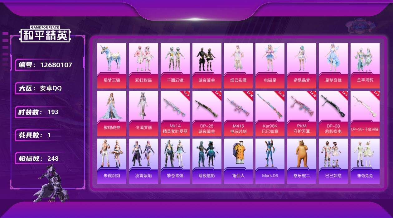 [12680107]【1119】安卓 手Q-10粉装-7特效枪-1载具-3粉色飞行器-82169热力值-15王牌印记-193套装-248枪皮 【热门品类】:套装-龟仙人,角色-Mark.06 【粉色载具】:星梦玉骢 【粉色套装】:粉装-彩虹甜喵,粉装-千面幻镜,粉装-暗夜鎏金,角色-烟云彩露,角色-电磁星,角色-鸢尾晶梦,角色-星梦奇缘,粉装-金丰海韵,角色-智耀战神,角色-冷漠罗丽 【粉色枪皮等级】:M416-电玩时刻(五级),Kar98K-巳巳如意(五级),Mk14-精灵梦叶罗丽(七级),DP-28-暗夜鎏金(七级),DP-28-千金淑猫(一级),DP-28-豹影疾电(一级),PKM-守护天翼(五级) 【粉色枪皮】:M416-电玩时刻,Kar98K-巳巳如意,Mk14-精灵梦叶罗丽,DP-28-暗夜鎏金,DP-28-千金淑猫,DP-28-豹影疾电,PKM-守护天翼 【粉色飞行器】:齐天大圣飞行器,天之羽翼飞行器,星梦奇缘飞行器 【粉色降落伞】:甜蜜誓约降落伞,四圣焕新降落伞,暗夜玫瑰降落伞,齐天大圣降落伞,暗星紫秘降落伞,恐龙拽拽降落伞,庄周梦蝶降落伞,太空嘟嘟降落伞,彩虹甜喵降落伞,暗夜鎏金降落伞,第五大道降落伞,仲夏莫吉托降落伞,圣堂之誓降落伞,精灵梦叶罗丽降落伞,星梦奇缘降落伞,守护天翼降落伞,千金淑猫降落伞,智耀战神降落伞,星穹咏叹调降落伞,冷漠罗丽降落伞 【稀有套装】:套装-龟仙人,玩偶服-憨乐熊二,套装-巳巳如意,套装-雏菊兔兔,套装-萝兰蝴蝶,套装-小熊娃娃,角色-拉斐尔,角色-狂花道·娜可露露,套装-糖糖葫芦,套装-青团波波,套装-棉花软糖,角色-都市丽猫,角色-摩登魅猫,套装-燕燕于飞,套装-鱼渊荷华,套装-晶辉守护,角色-蜜桃派对,套装-风舞幻音,套装-粉恋花,套装-紫幽梦,套装-蓝冰羽,套装-星影赞美诗,套装-星渊小夜曲,套装-彩虹兔,套装-云朵鹅,套装-雪绒豹,角色-灵公主,套装-朱霞炽焰,套装-凌霄紫焰,套装-擎苍青焰 【稀有枪皮】:AKM-夜灯,AKM-彩虹符号,AKM-破晓战魂,AKM-胡桃卫兵,AKM-萌趣颜团子,AKM-虎虎生威,AKM-霓虹街区,AKM-龙的传人,M16A4-幻世战舞者,M16A4-甜心亚梦,M16A4-生命誓言,M16A4-红色方程式,M16A4-千金淑猫,SCAR-L-玉兔迎春,SCAR-L-生命誓言,SCAR-L-红色方程
