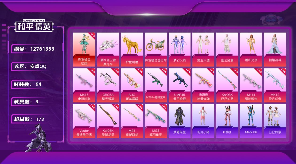 [12761353]【1184】安卓 手Q-1神装-5粉装-13特效枪-3载具-9粉色飞行器-61965热力值-8王牌印记-94套装-173枪皮