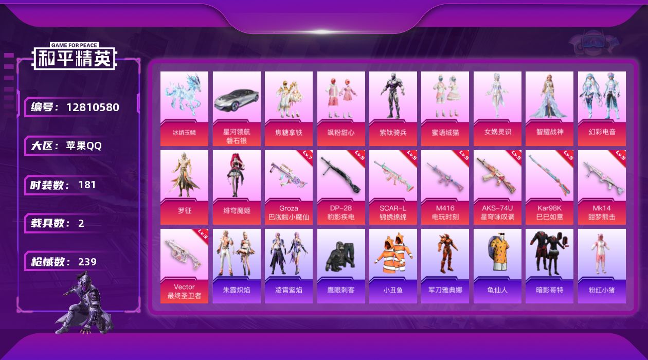 [12810580]【1212】苹果 手Q-9粉装-8特效枪-2载具-7粉色飞行器-77443热力值-14王牌印记-181套装-239枪皮