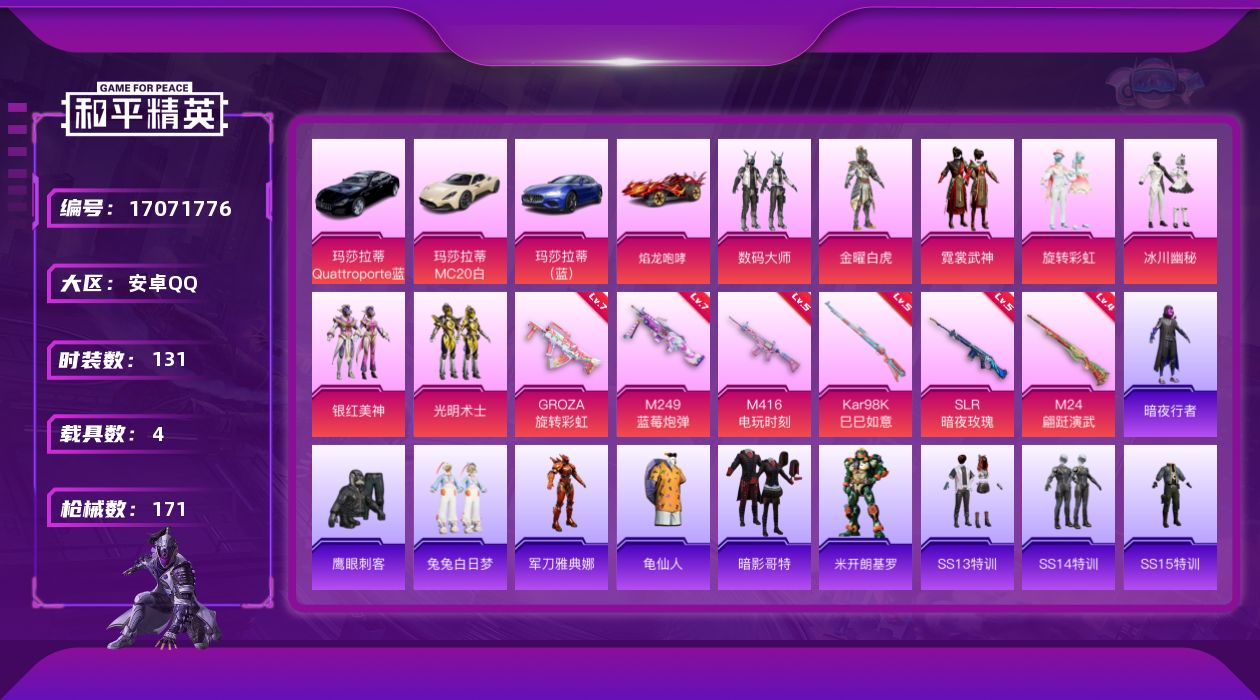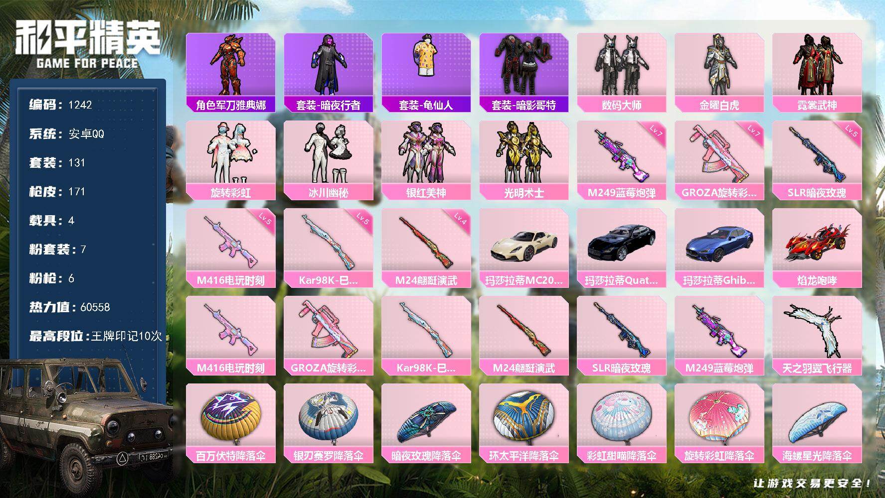[17071776]【1242】安卓 手Q-7粉装-6特效枪-4载具-1粉色飞行器-60558热力值-10王牌印记-131套装-171枪皮
