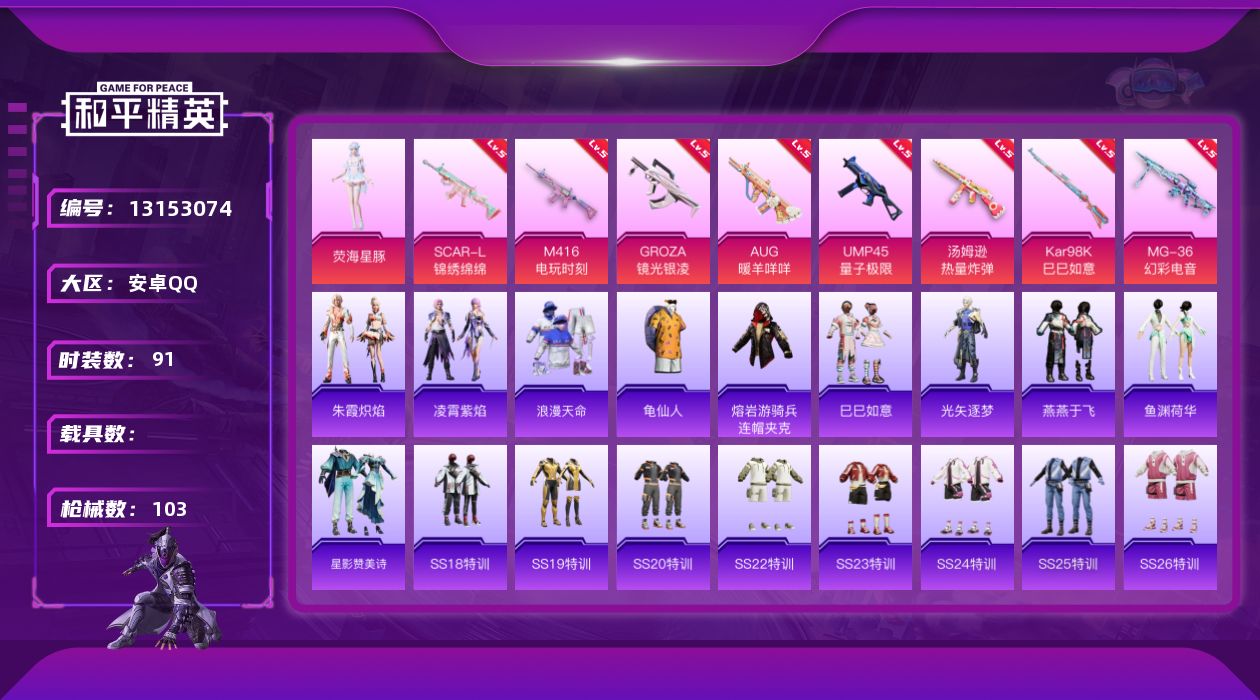 [13153074]【1414】安卓 手Q-1粉装-8特效枪-0载具-0粉色飞行器-30091热力值-4王牌印记-91套装-103枪皮