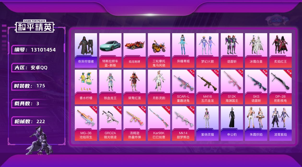 - [13868152]苹果 手Q-无敌战神框-7粉装-7特效枪-3载具-1粉色飞行器-65785热力值-15王牌印记-160套装-198枪皮 【热门品类】:粉装-缤纷油彩,绝对防御上衣,套装-浪漫天命,套装-深海小丑鱼,套装-小丑鱼,套装-奇异狩猎者,角色-军刀雅典娜,套装-天网终结者,套装-金羽特工,旭日初心兜帽大衣,套装-粉红小猪 【粉色载具】:保时捷918 Spyder(液态银),鬼马风驰,冰绡玉鳞 【粉色套装】:粉装-缤纷油彩,粉装-苍蓝魅影,角色-零号机款机体服,粉装-星穹咏叹调,角色-狂魅哈莉,角色-绯穹魔姬,角色-冰魄 【粉色枪皮等级】:AKM-梦之光华(四级),M416-心之恋语(六级),AUG-圣斗士星矢(七级),Mk14-甜梦熊击(五级),AMR-智耀战神(五级),DP-28-豹影疾电(五级),MG-36-幻彩电音(五级) 【粉色枪皮】:AKM-梦之光华,M416-心之恋语,AUG-圣斗士星矢,Mk14-甜梦熊击,AMR-智耀战神,DP-28-豹影疾电,MG-36-幻彩电音 【粉色飞行器】:灵珠游龙飞行器 【粉色降落伞】:繁花小夜曲降落伞,环太平洋降落伞,未来歌姬降落伞,智耀战神降落伞,幻彩电音降落伞,双重狂想降落伞,绯穹魔姬降落伞,无垠阁降落伞,魔童闹海 敖丙降落伞 【稀有套装】:套装-粉恋花,套装-紫幽梦,套装-蓝冰羽,套装-霓虹热舞,套装-极速光影,套装-彩虹兔,套装-云朵鹅,套装-雪绒豹,套装-诡诞巡游,角色-绛羽幽主,套装-朱霞炽焰,套装-凌霄紫焰,套装-擎苍青焰,角色-申公豹 【稀有枪皮】:AKM-PEL轰鸣竞梦者,AKM-夜灯,AKM-灼热熔岩,AKM-玉龙,AKM-萌趣颜团子,AKM-霓虹街区,AKM-龙的传人,M16A4-机械英豪,M16A4-莲影清波,SCAR-L-炫彩节奏,SCAR-L-王牌四分卫,SCAR-L-红色方程式,SCAR-L-黄金龙骨,M416-夜灯,M416-神秘黑猫,M416-红色方程式,GROZA-彩虹符号,GROZA-懵萌河马,GROZA-治愈之星,GROZA-黑色刀锋,AUG-炫光贝贝,AUG-终结者,AUG-青春冒险家,QBZ-原初圣火,QBZ-彩虹符号,QBZ-未来歌姬,M762-奇异狩猎者,M762-牛气冲天,M762-绯红前夜,M762-镭射皇者,M762-云朵鹅,Mk47-百万伏特,Mk47-青春冒险家,G36C