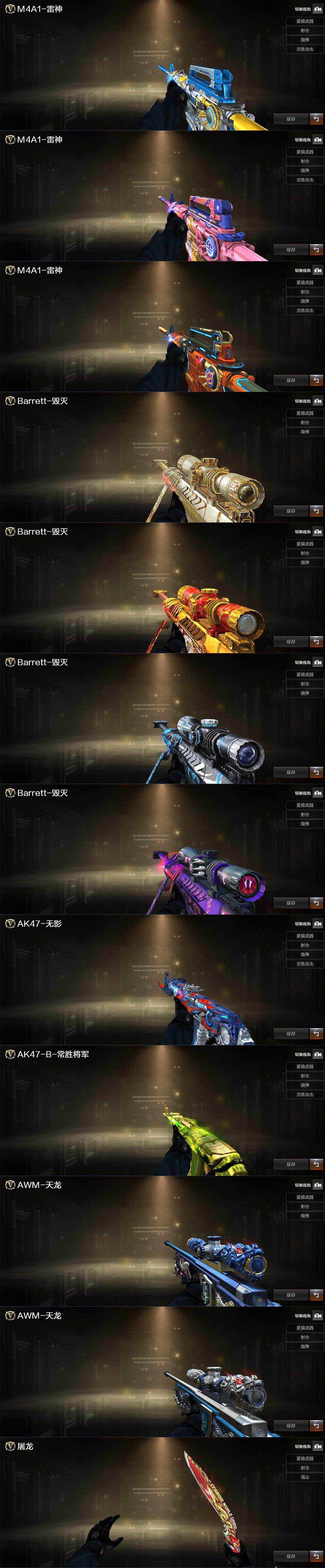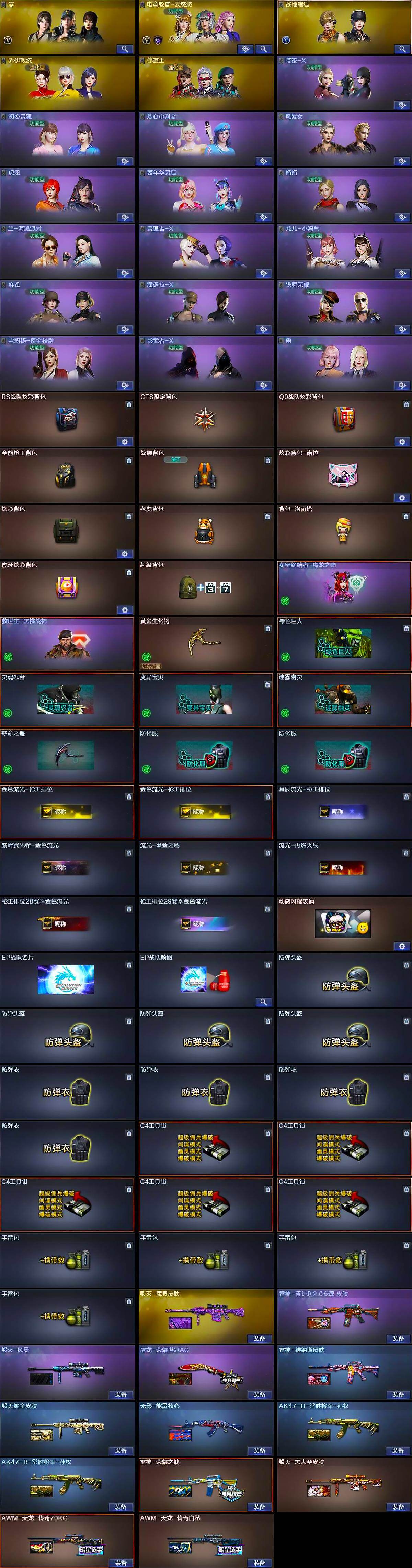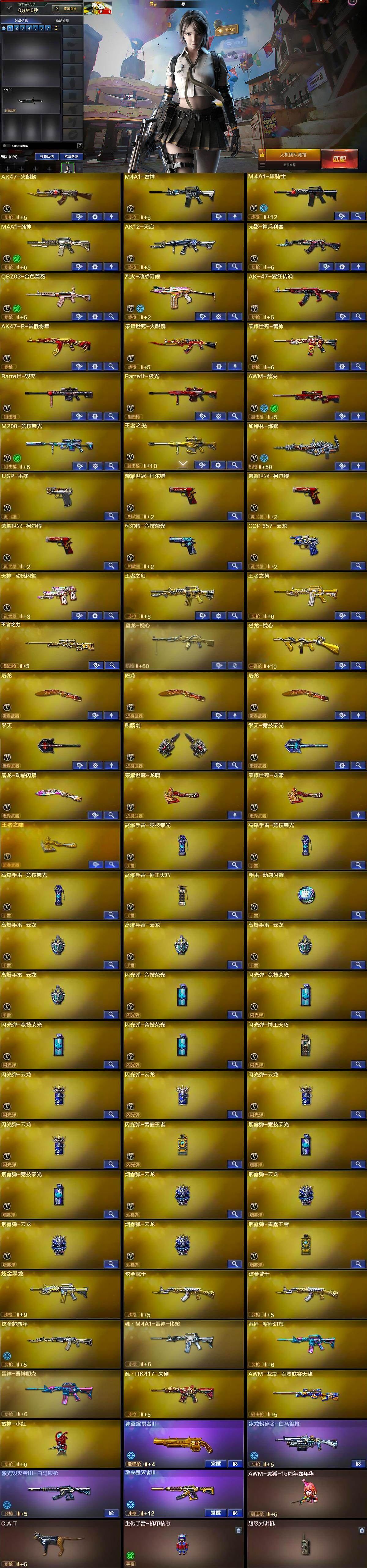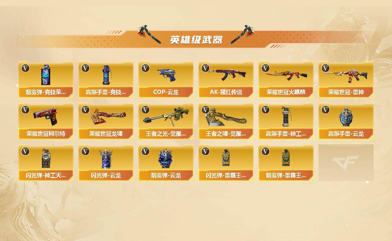 【英雄级武器】:AK47-火麒麟,M4A1-雷神,M4A1-黑骑士,M4A1-死神,AK12-天启,无影-神兵利器,QBZ03-金色蔷薇,烈火-动感闪耀,AK-47-猩红传说,AK47-B-常胜将军,荣耀世冠-火麒麟,荣耀世冠-雷神,Barrett-毁灭,Barrett-极光,AWM-裁决,M200-竞技荣光,王者之光-觉醒版,加特林-炼狱,USP-雷暴,荣耀世冠-柯尔特*3,柯尔特-竞技荣光,COP 357-云龙,天神-动感闪耀,屠龙*3,擎天,麒麟刺,擎天-竞技荣光,屠龙-动感闪耀,荣耀世冠-龙啸*2,王者之啸-觉醒版,高爆手雷-竞技荣光*3,高爆手雷-神工天巧,手雷-动感闪耀,高爆手雷-云龙*4,闪光弹-竞技荣光*4,闪光弹-神工天巧,闪光弹-云龙*4,闪光弹-雷霆王者-觉醒版,烟雾弹-竞技荣光*2,烟雾弹-云龙*4,烟雾弹-雷霆王者-觉醒版