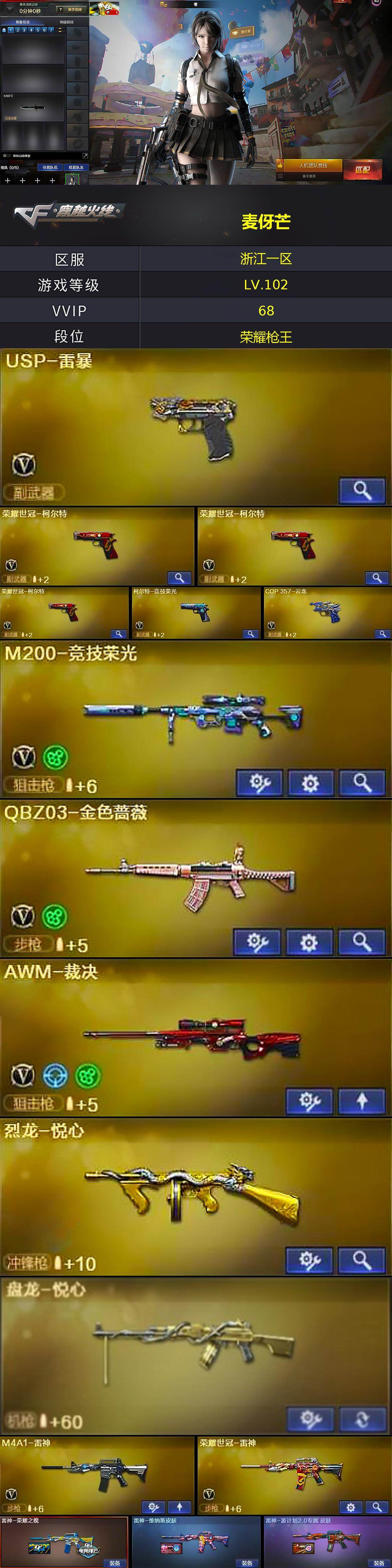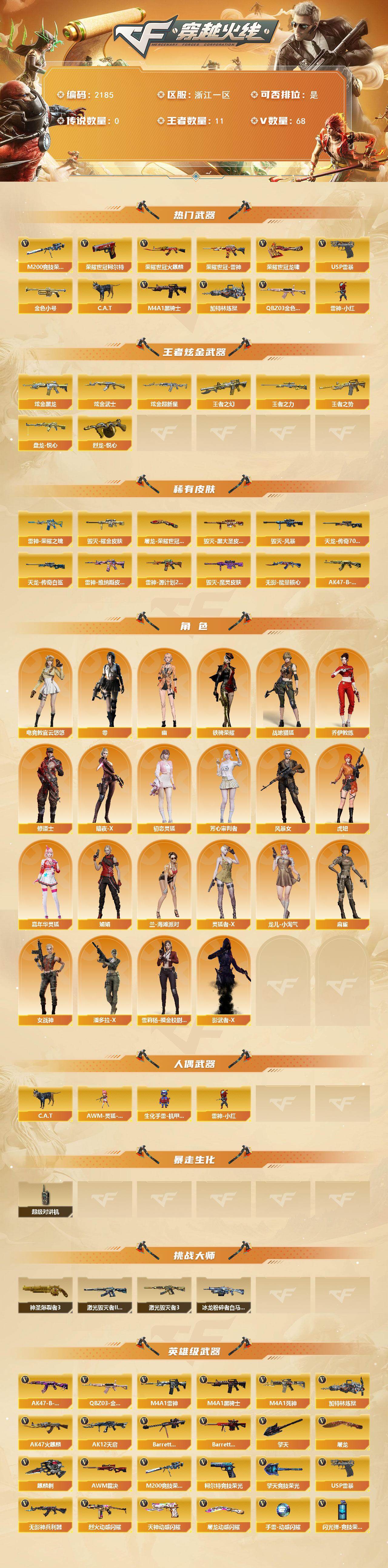 [16947301]浙江一区-72V-11王者武器数-4炫金武器数 【热门武器】:QBZ03-金色蔷薇,M200-竞技荣光,荣耀世冠-火麒麟,荣耀世冠-雷神,荣耀世冠-柯尔特*3,金色小号,C.A.T,M4A1-黑骑士,加特林-炼狱,雷神-小红,USP-雷暴,荣耀世冠-龙啸*2 【王者炫金武器】:王者之幻,王者之势,王者之力,盘龙-悦心,烈龙-悦心,炫金黑龙,炫金武士*2,炫金超新星 【皮肤】:雷神-荣耀之魄,雷神-维纳斯皮肤,雷神-源计划2.0专属 皮肤,毁灭耀金皮肤,毁灭-黑大圣皮肤,毁灭-风暴,毁灭-魔灵皮肤,无影-能量核心,AK47-B-常胜将军-孙权*2,AWM-天龙-传奇70KG,AWM-天龙-传奇白鲨,屠龙-荣耀世冠AG 【角色】:零,电竞教官-云悠悠,战地猎狐,乔伊教练,修道士,暗夜-X,初恋灵狐,芳心审判者,风暴女,虎妞,嘉年华灵狐,娟娟,兰-海滩派对,灵狐者-X,龙儿-小淘气,麻雀,女战神,潘多拉-X,铁骑荣耀,雪莉杨-摸金校尉,影武者-X,幽 【人偶武器】:雷神-小红,AWM-灵狐-15周年嘉年华,C.A.T,生化手雷-机甲核心 【暴走生化】:超级对讲机 【挑战大师】:神圣爆裂者III,冰龙粉碎者-白马银枪,激光毁灭者III-白马银枪,激光毁灭者III 【英雄级武器】:AK47-火麒麟,M4A1-雷神,M4A1-黑骑士,M4A1-死神,AK12-天启,无影-神兵利器,QBZ03-金色蔷薇,烈火-动感闪耀,AK-47-猩红传说,AK47-B-常胜将军,荣耀世冠-火麒麟,荣耀世冠-雷神,Barrett-毁灭,Barrett-极光,AWM-裁决,M200-竞技荣光,王者之光-觉醒版,加特林-炼狱,USP-雷暴,荣耀世冠-柯尔特*3,柯尔特-竞技荣光,COP 357-云龙,天神-动感闪耀,屠龙*3,擎天,麒麟刺,擎天-竞技荣光,屠龙-动感闪耀,荣耀世冠-龙啸*2,王者之啸-觉醒版,高爆手雷-竞技荣光*3,高爆手雷-神工天巧,手雷-动感闪耀,高爆手雷-云龙*4,闪光弹-竞技荣光*4,闪光弹-神工天巧,闪光弹-云龙*4,闪光弹-雷霆王者-觉醒版,烟雾弹-竞技荣光*2,烟雾弹-云龙*4,烟雾弹-雷霆王者-觉醒版 【道具】:BS战队炫彩背包,CFS限定背包,Q9战队炫彩背包,全能枪王背包,战舰背包,炫彩背包-诺拉,炫彩背包,老虎背包,背包-洛丽塔,虎牙炫彩背包,超级背包,哔哩哔