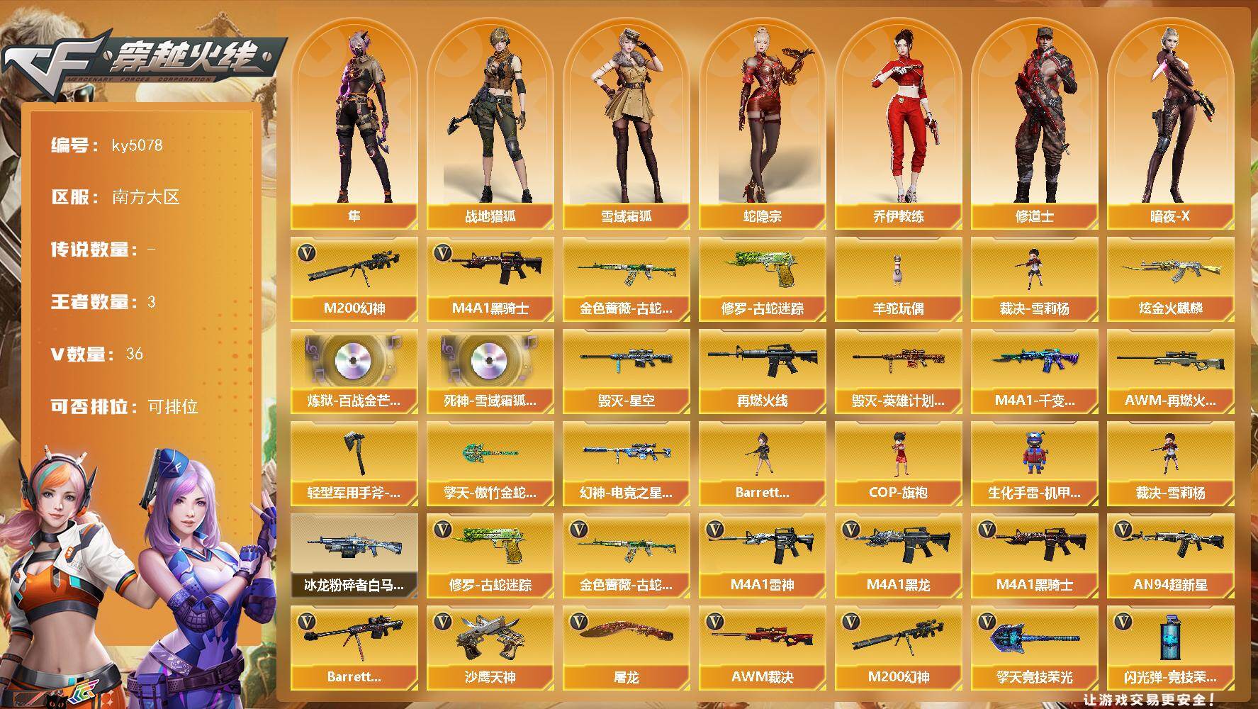 [16849490]南方大区-36V-3王者-1炫金 【热门武器】:M200-幻神,金色蔷薇-古蛇迷踪,修罗-古蛇迷踪,M4A1-黑骑士,羊驼玩偶,裁决-雪莉杨 【王者炫金武器】:炫金火麒麟 【音效卡】:炼狱-百战金芒-庆典舞曲音效卡,死神-雪域霜狐-怀旧音效卡 【皮肤】:幻神-电竞之星 皮肤,M4A1-再燃火线,毁灭-星空,毁灭-英雄计划 皮肤,M4A1-千变-孔明皮肤,AWM-再燃火线,轻型军用手斧-再燃火线,擎天-傲竹金蛇 皮肤 【角色】:隼,战地猎狐,雪域霜狐,蛇隐宗,乔伊教练,修道士,暗夜-X,兰妹妹,0号玩家,蛇姬,兔囡囡,智影 【人偶武器】:裁决-雪莉杨,COP-旗袍,生化手雷-机甲核心*3,Barrett-夜玫瑰 【挑战大师】:冰龙粉碎者-白马银枪 【英雄级武器】:M4A1-黑龙,M4A1-雷神,M4A1-黑骑士,AN94-超新星,金色蔷薇-古蛇迷踪,Barrett-毁灭,AWM-裁决,M200-幻神,炼狱-百战金芒,沙鹰-天神*2,修罗-古蛇迷踪,屠龙*2,擎天-竞技荣光,麒麟刺-百战金芒,高爆手雷-竞技荣光*4,高爆手雷-古蛇迷踪,闪光弹-竞技荣光*4,闪光弹-雷霆王者-觉醒版,烟雾弹-竞技荣光*4,烟雾弹-古蛇迷踪,烟雾弹-雷霆王者-觉醒版,M4A1-赤狱骑士,M4A1-苍鸣雷神 【道具】:BS战队炫彩背包,CFS限定背包,EP战队炫彩背包,云山科技背包,亚洲杯纪念炫彩背包,古蛇迷踪炫彩背包,炫彩背包-诺拉,牛魔王背包-至尊黄金,百战金芒炫彩背包,超级背包,雪域霜狐炫彩背包,女皇终结者-魔龙之吻,救世主-黑桃战神,黄金生化钩,绿色巨人,灵魂忍者*2,变异宝贝,迷雾幽灵*2,夺命之镰,防化服*3,流光-鎏金之域,流光-再燃火线,枪王排位28赛季金色流光,枪王排位29赛季金色流光,语音特效-盛典烟火,语音特效-怀旧,古蛇迷踪打击特效,雪域霜狐表情,蛇隐宗表情,萌萌小葵表情,防弹头盔*3,防弹衣*3,C4工具钳*3,手雷包*3 【特殊枪械】:1黑骑士