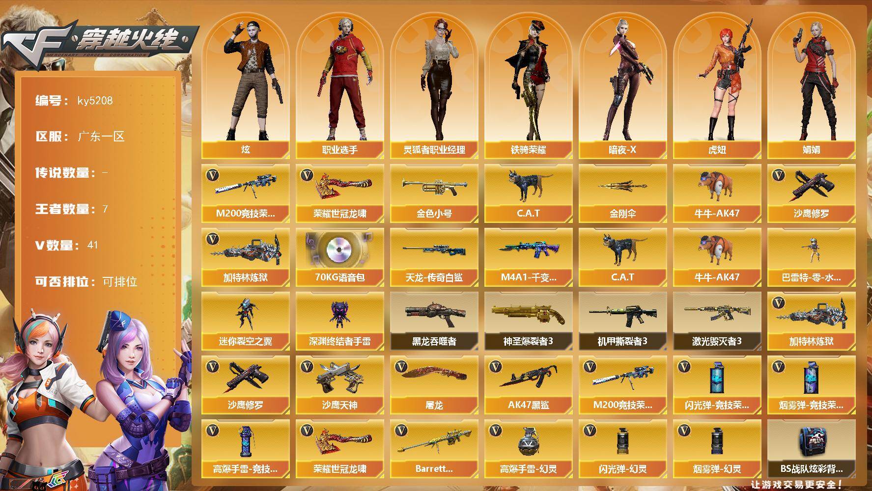 [16879341]广东一区-41V-7王者-0炫金 【热门武器】:M200-竞技荣光,金色小号,C.A.T,牛牛-AK47,加特林-炼狱,沙鹰-修罗,荣耀世冠-龙啸,金刚伞 【音效卡】:70KG语音包 【皮肤】:M4A1-千变-孔明皮肤,AWM-天龙-传奇白鲨 【角色】:炫,暗夜-X,虎妞,娟娟,灵狐者-职业经理,潘多拉-X,潘多拉-甜心教官,铁骑荣耀,雪莉杨-摸金校尉,职业选手 【人偶武器】:巴雷特-零-水下丽影,C.A.T,牛牛-AK47,迷你裂空之翼*3,深渊终结者手雷 【暴走生化】:黑龙吞噬者 【挑战大师】:神圣爆裂者III,激光毁灭者III,机甲撕裂者III 【英雄级武器】:AK47-黑鲨,M200-竞技荣光,Barrett-雷霆王者-觉醒版,加特林-炼狱,沙鹰-修罗,沙鹰-天神,屠龙*2,荣耀世冠-龙啸,高爆手雷-幻灵,高爆手雷-竞技荣光*7,闪光弹-幻灵,闪光弹-竞技荣光*7,烟雾弹-幻灵*2,烟雾弹-竞技荣光*7 【道具】:BS战队炫彩背包,冰冰企鹅背包-猛男专用,超级背包,黄金生化钩,绿色巨人,灵魂忍者,迷雾幽灵,夺命之镰,防化服*2,电玩兔兔表情,斯沃特表情,CFPL选手表情-第2套,C4-红龙,防弹头盔*4,防弹衣*4,C4工具钳*3,手雷包*3 【特殊枪械】:1炼狱