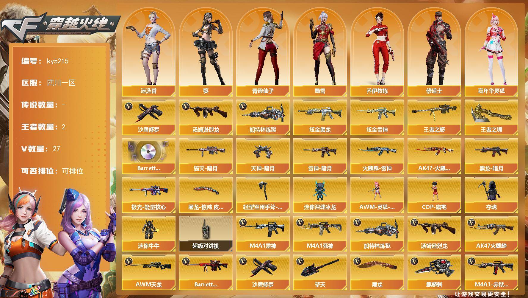 [16851907]四川一区-27V-2王者-2炫金 【热门武器】:汤姆逊-烈龙,加特林-炼狱,沙鹰-修罗*4 【王者炫金武器】:王者之怒,王者之啸,炫金黑龙,炫金雷神 【音效卡】:Barrett-碧霄极光音效卡 【皮肤】:雷神-暗月,火麒麟-雷神,AK47-火麒麟-百城23冠军皮肤,毁灭-暗月,黑龙-暗月,极光-能量核心,天神-暗月,屠龙-惊鸿 皮肤,轻型军用手斧-再燃火线 【角色】:葵,迷迭香,乔伊教练,修道士,嘉年华灵狐,娟娟,灵狐者-黄金海岸,龙儿-小淘气,潘多拉-X,潘多拉-甜心教官,青霞仙子,蜀雪,维纳斯,雪莉杨-摸金校尉,夜玫瑰-宠粉 【人偶武器】:AWM-灵狐-15周年嘉年华,COP-旗袍,迷你深渊冰龙,夺魂,迷你牛牛 【暴走生化】:超级对讲机 【英雄级武器】:AK47-火麒麟,M4A1-雷神,M4A1-死神,AWM-天龙,Barrett-极光*2,加特林-炼狱,汤姆逊-烈龙,沙鹰-修罗*4,屠龙,擎天,麒麟刺,麒麟刺-百战金芒,M4A1-赤狱骑士 【道具】:BS战队炫彩背包,亚洲杯纪念炫彩背包,女皇终结者-背包,战舰背包,炫彩背包,百战金芒炫彩背包,女皇终结者-魔龙之吻,救世主-黑桃战神,妩媚妖姬,绿色巨人,灵魂忍者,变异宝贝,迷雾幽灵,夺命之镰,防化服*3,枪王排位28赛季金色流光,枪王排位29赛季金色流光,萌萌小葵表情,电玩兔兔表情,炽雪表情,防弹头盔*9,防弹衣*8,C4工具钳*8,手雷包*8 【特殊枪械】:1烈龙,1炼狱