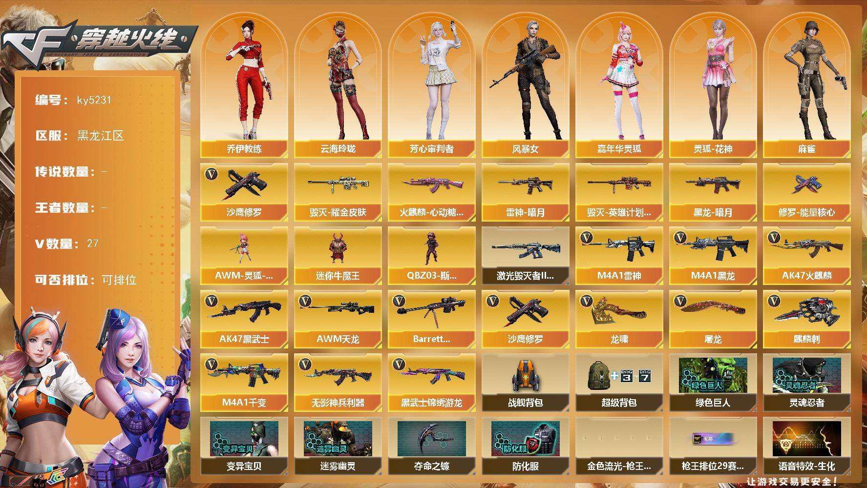 [16852230]黑龙江区-27V-0王者-0炫金 【热门武器】:沙鹰-修罗*2 【皮肤】:雷神-暗月,火麒麟-心动糖果,毁灭耀金皮肤,毁灭-英雄计划 皮肤,黑龙-暗月,修罗-能量核心 【角色】:乔伊教练,云海玲珑,芳心审判者,风暴女,嘉年华灵狐,灵狐-花神,麻雀,曼陀罗-X,曼陀罗-礼服,玫瑰花神,潘多拉-X,潘多拉-甜心教官,斯沃特-X,兔囡囡,游珑儿,智影 【人偶武器】:AWM-灵狐-15周年嘉年华,迷你牛魔王,QBZ03-斯沃特 【挑战大师】:激光毁灭者III-白马银枪 【英雄级武器】:M4A1-千变,AK47-火麒麟*3,M4A1-黑龙,M4A1-雷神,AK47-黑武士,无影-神兵利器,黑武士-锦绣游龙,AWM-天龙*2,Barrett-毁灭,沙鹰-修罗*2,屠龙*3,龙啸,麒麟刺 【道具】:战舰背包,超级背包,绿色巨人,灵魂忍者*2,变异宝贝,迷雾幽灵*2,夺命之镰,防化服*2,金色流光-枪王排位*2,枪王排位28赛季金色流光,枪王排位29赛季金色流光,语音特效-生化,云海游龙表情,防弹头盔*4,防弹衣*4,C4工具钳*3,手雷包*3 【特殊枪械】: