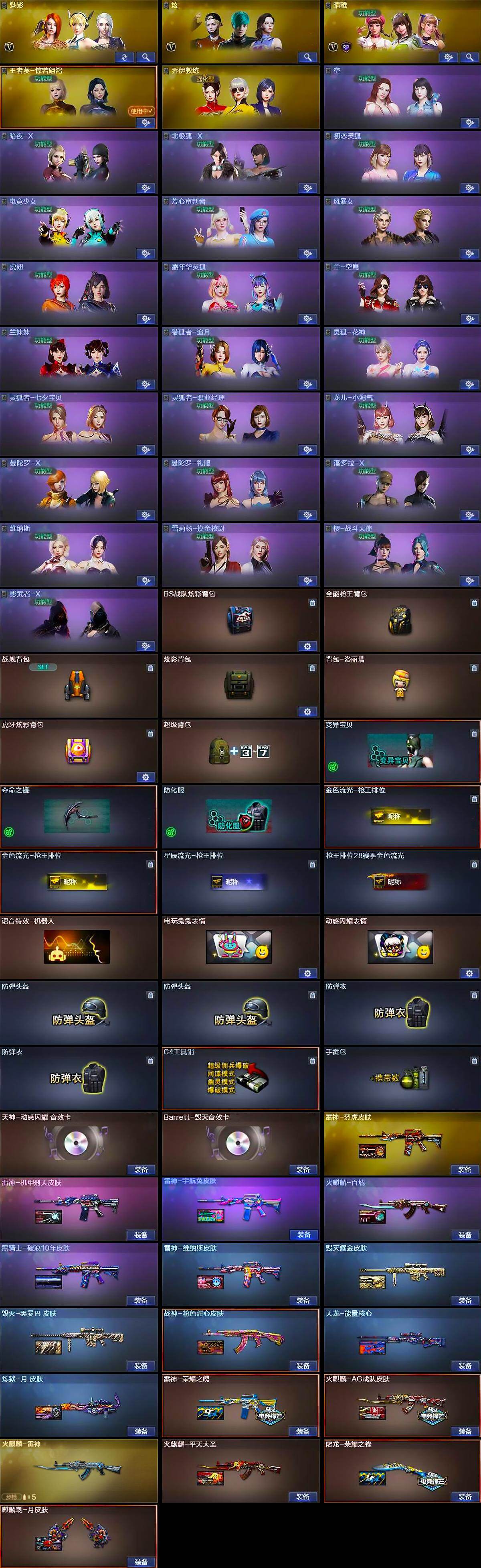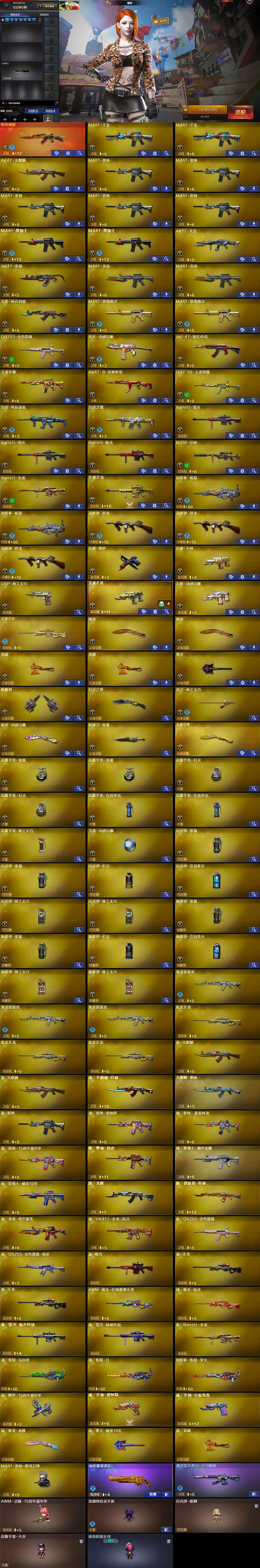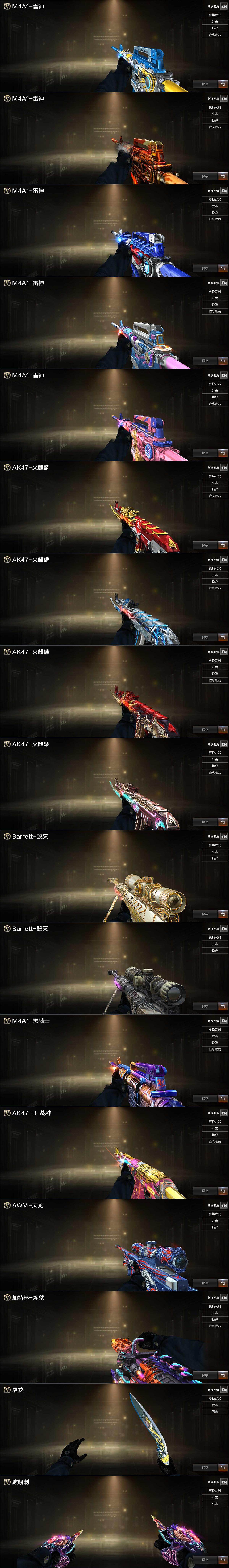 【英雄级武器】:M4A1-千变*2,AK47-火麒麟,M4A1-雷神*5,M4A1-黑骑士*2,AK12-天启,AK47-黑鲨,M4A1-龙血*2,无影-神兵利器,M4A1-玫瑰精灵*2,QBZ03-金色蔷薇,烈火-动感闪耀,AK-47-猩红传说,王者火魄-觉醒版,AK47-B-常胜将军,QBZ-03-王者蔷薇-觉醒版,白虎-电玩蓝兔,白虎之魄-觉醒版,Barrett-毁灭*2,Barrett-极光,M200-幻神,Barrett-朱雀,王者之光-觉醒版,加特林-炼狱*2,汤姆逊-烈龙*3,沙鹰-修罗,沙鹰-天神,USP-神工天巧,王者之灵-觉醒版,天神-动感闪耀,屠龙*2,龙啸*2,擎天,麒麟刺,幻灵之锋,唐刀-神工天巧,屠龙-动感闪耀,斩神刀-雷暴,王者之锋-觉醒版,高爆手雷-雷暴*2,高爆手雷-幻