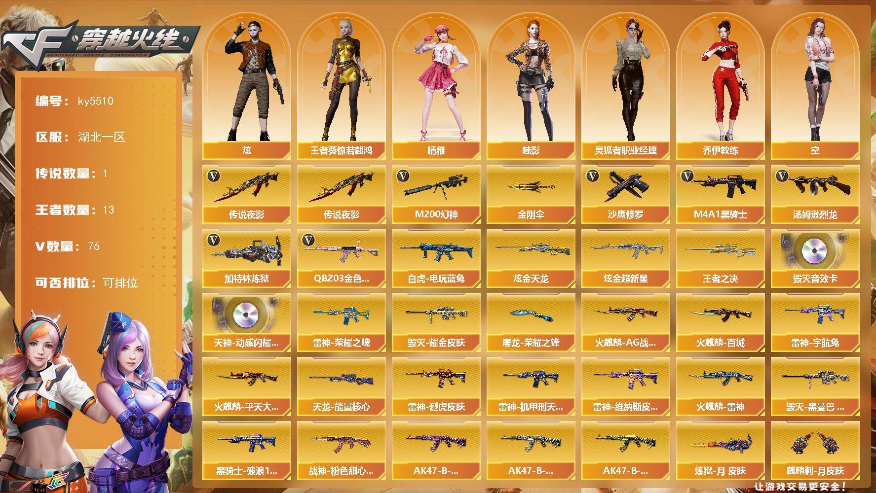 [16909278]湖北一区-82V-13王者武器数-6炫金武器数 【传说武器】:传说夜影 【热门武器】:传说夜影,QBZ03-金色蔷薇,M200-幻神,白虎-电玩蓝兔,M4A1-黑骑士*2,汤姆逊-烈龙*3,加特林-炼狱*2,沙鹰-修罗,金刚伞 【王者炫金武器】:王者之决,炫金超新星*3,炫金天龙*3 【音效卡】:天神-动感闪耀 音效卡,Barrett-毁灭音效卡 【皮肤】:雷神-荣耀之魄,雷神-烈虎皮肤,雷神-机甲刑天皮肤,雷神-宇航兔皮肤,雷神-维纳斯皮肤,火麒麟-AG战队皮肤,火麒麟-雷神,火麒麟-平天大圣,火麒麟-百城,毁灭耀金皮肤,毁灭-黑曼巴 皮肤,黑骑士-破浪10年皮肤,战神-粉色甜心皮肤,AK47-B-常胜将军-曹操*2,AK47-B-常胜将军-刘备,AK47-B-常胜将军-孙权*2,天龙-能量核心,炼狱-月 皮肤,屠龙-荣耀之锋,麒麟刺-月皮肤 【角色】:魅影,炫,晴雅,王者葵-惊若翩鸿,乔伊教练,空,暗夜-X,北极狐-X,初恋灵狐,电竞少女,芳心审判者,风暴女,虎妞,嘉年华灵狐,兰-空鹰,兰妹妹,猎狐者-追月,灵狐-花神,灵狐者-七夕宝贝,灵狐者-职业经理,龙儿-小淘气,曼陀罗-X,曼陀罗-礼服,潘多拉-X,赛斯-X,兔囡囡,维纳斯,雪莉杨-摸金校尉,樱-战斗天使,影武者-X 【人偶武器】:M4A1-雷神-精英刀锋,AWM-灵狐-15周年嘉年华,深渊终结者手雷,闪光弹-貂蝉,高爆手雷-大乔,迷你超能女侍 【挑战大师】:神圣爆裂者III,激光毁灭者III-白马银枪 【英雄级武器】:M4A1-千变*2,AK47-火麒麟,M4A1-雷神*5,M4A1-黑骑士*2,AK12-天启,AK47-黑鲨,M4A1-龙血*2,无影-神兵利器,M4A1-玫瑰精灵*2,QBZ03-金色蔷薇,烈火-动感闪耀,AK-47-猩红传说,王者火魄-觉醒版,AK47-B-常胜将军,QBZ-03-王者蔷薇-觉醒版,白虎-电玩蓝兔,白虎之魄-觉醒版,Barrett-毁灭*2,Barrett-极光,M200-幻神,Barrett-朱雀,王者之光-觉醒版,加特林-炼狱*2,汤姆逊-烈龙*3,沙鹰-修罗,沙鹰-天神,USP-神工天巧,王者之灵-觉醒版,天神-动感闪耀,屠龙*2,龙啸*2,擎天,麒麟刺,幻灵之锋,唐刀-神工天巧,屠龙-动感闪耀,斩神刀-雷暴,王者之锋-觉醒版,高爆手雷-雷暴*2,高爆手雷-幻