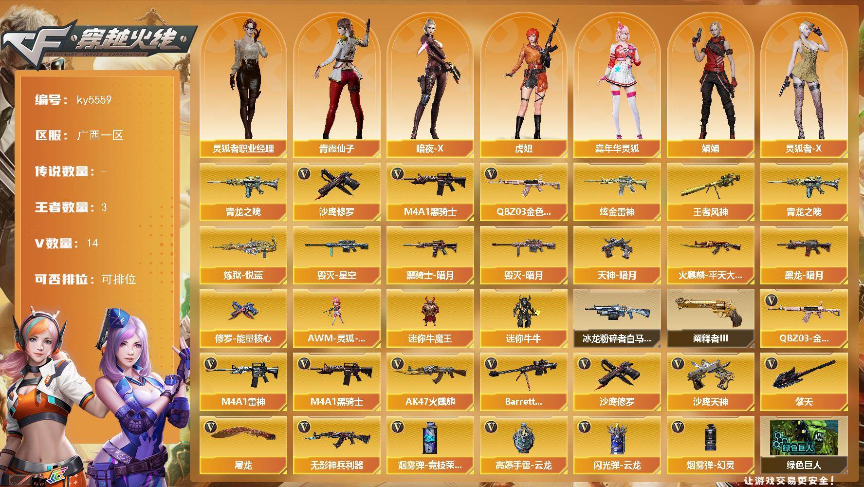 [16909761]广西一区-14V-3王者武器数-1炫金武器数 【热门武器】:QBZ03-金色蔷薇,青龙之魄,M4A1-黑骑士,沙鹰-修罗 【王者炫金武器】:青龙之魄,王者风神,炼狱-悦蓝,炫金雷神 【皮肤】:火麒麟-平天大圣,毁灭-暗月,毁灭-星空,黑龙-暗月,黑骑士-暗月,修罗-能量核心,天神-暗月 【角色】:暗夜-X,虎妞,嘉年华灵狐,娟娟,0号玩家,灵狐者-X,灵狐者-职业经理,曼陀罗-X,玫瑰花神,潘多拉-X,潘多拉-甜心教官,青霞仙子,兔囡囡 【人偶武器】:AWM-灵狐-15周年嘉年华,迷你牛魔王,迷你牛牛 【挑战大师】:冰龙粉碎者-白马银枪,阐释者III 【英雄级武器】:AK47-火麒麟,M4A1-雷神,M4A1-黑骑士,无影-神兵利器,QBZ03-金色蔷薇,Barrett-毁灭,沙鹰-修罗,沙鹰-天神,屠龙,擎天,高爆手雷-云龙,闪光弹-云龙,烟雾弹-幻灵,烟雾弹-竞技荣光 【道具】:绿色巨人,灵魂忍者,迷雾幽灵,夺命之镰,防化服*2,金色流光-枪王排位*2,星辰流光-枪王排位,枪王排位28赛季金色流光,枪王排位29赛季金色流光,防弹头盔*4,防弹衣*4,C4工具钳*5,手雷包*5 【特殊枪械】:1黑骑士
