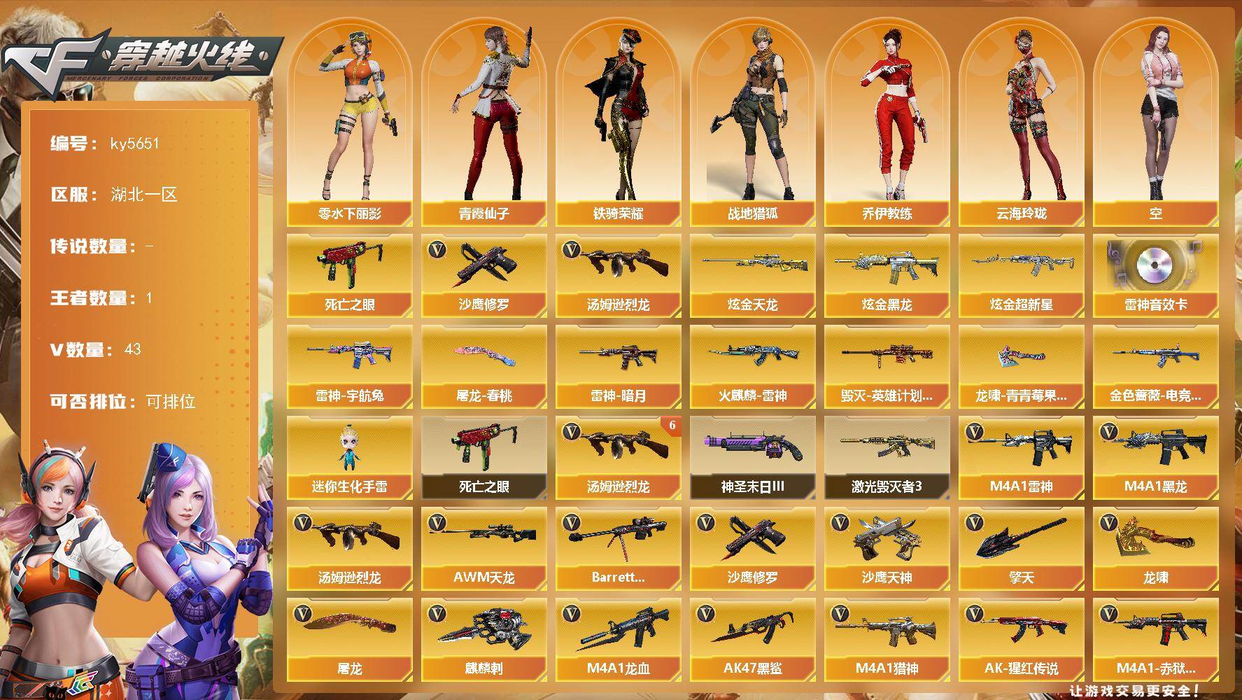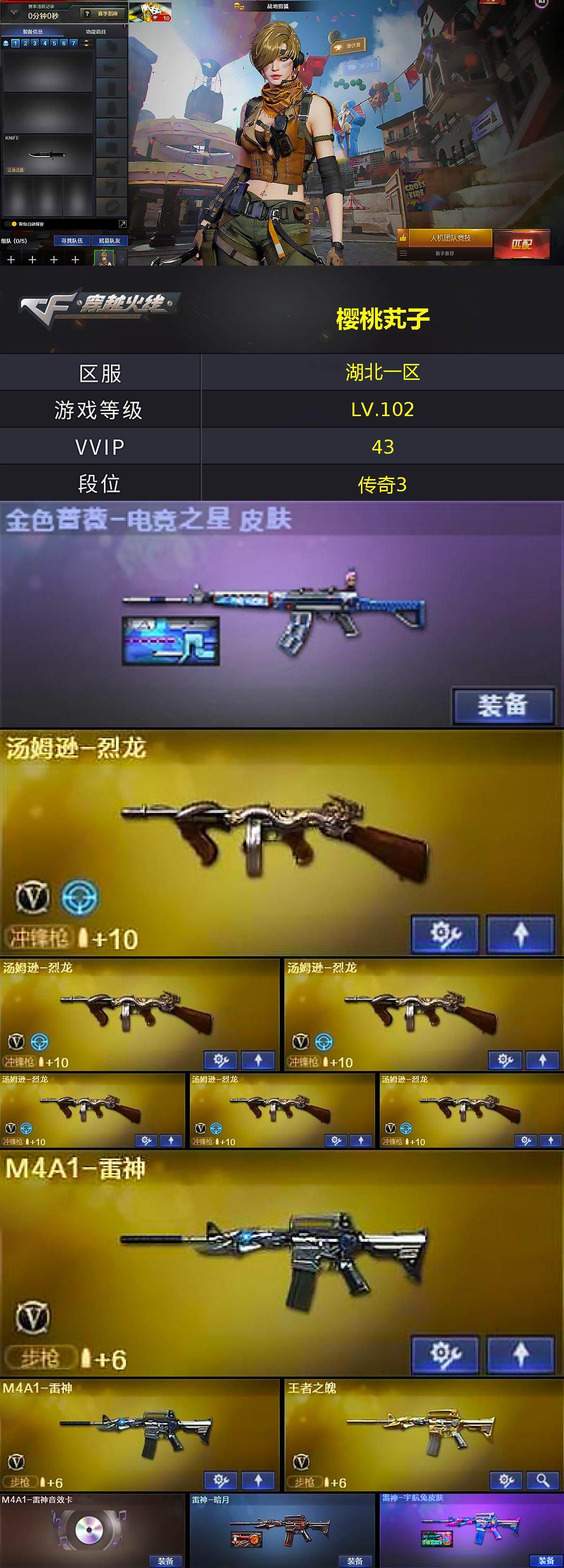 [16729104]湖北一区-47V-1王者武器数-3炫金武器数 【热门武器】:死亡之眼,汤姆逊-烈龙*6,沙鹰-修罗*2 【王者炫金武器】:炫金黑龙,炫金超新星,炫金天龙 【音效卡】:M4A1-雷神音效卡 【皮肤】:金色蔷薇-电竞之星 皮肤,雷神-暗月,雷神-宇航兔皮肤,火麒麟-雷神,毁灭-英雄计划 皮肤,屠龙-春桃 皮肤,龙啸-青青莓果 皮肤 【角色】:战地猎狐,乔伊教练,云海玲珑,空,娟娟,零-水下丽影,灵狐者-黄金海岸,麻雀,潘多拉-甜心教官,青霞仙子,铁骑荣耀,兔囡囡,新娜塔莎,影武者-X 【人偶武器】:迷你生化手雷 【暴走生化】:死亡之眼 【挑战大师】:激光毁灭者III,神圣爆裂者-末日III 【英雄级武器】:M4A1-黑龙,M4A1-雷神*2,AK47-黑鲨*2,M4A1-龙血,M4A1-猎神,王者之魄-觉醒版,AK-47-猩红传说,AWM-天龙,Barrett-毁灭*5,汤姆逊-烈龙*6,沙鹰-修罗*2,沙鹰-天神*2,屠龙*2,龙啸*2,擎天,麒麟刺,高爆手雷-雷霆*2,闪光弹-雷霆*2,烟雾弹-雷霆*2,M4A1-赤狱骑士 【道具】:亚洲杯纪念炫彩背包,冰冰企鹅背包,战舰背包,超级背包,救世主-黑桃战神,妩媚妖姬,绿色巨人,灵魂忍者,变异宝贝,迷雾幽灵,夺命之镰*2,防化服*2,枪王排位29赛季金色流光,C4-沙漠,防弹头盔*4,防弹衣*4,C4工具钳*4,手雷包*3 【特殊枪械】:6烈龙