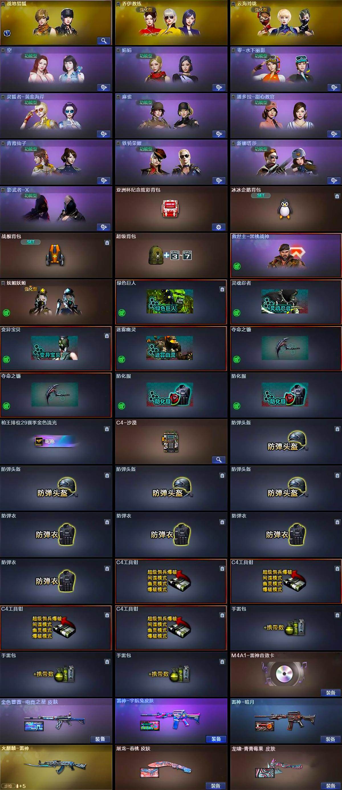 【道具】:亚洲杯纪念炫彩背包,冰冰企鹅背包,战舰背包,超级背包,救世主-黑桃战神,妩媚妖姬,绿色巨人,灵魂忍者,变异宝贝,迷雾幽灵,夺命之镰*2,防化服*2,枪王排位29赛季金色流光,C4-沙漠,防弹头盔*4,防弹衣*4,C4工具钳*4,手雷包*3