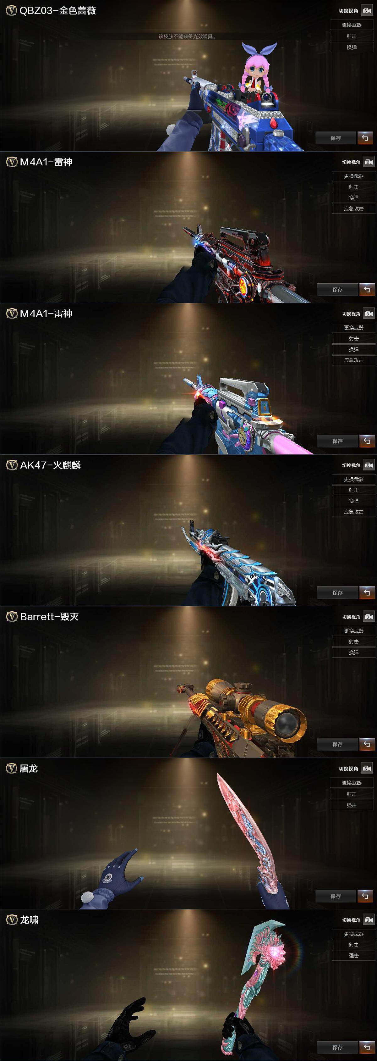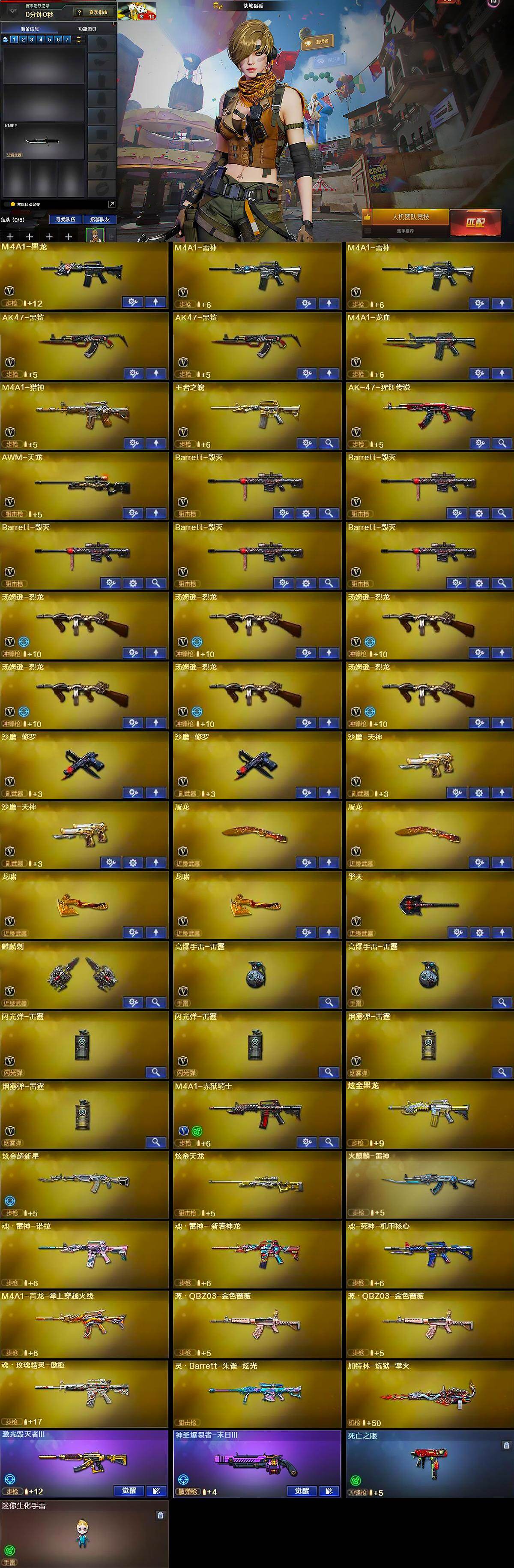 【英雄级武器】:M4A1-黑龙,M4A1-雷神*2,AK47-黑鲨*2,M4A1-龙血,M4A1-猎神,王者之魄-觉醒版,AK-47-猩红传说,AWM-天龙,Barrett-毁灭*5,汤姆逊-烈龙*6,沙鹰-修罗*2,沙鹰-天神*2,屠龙*2,龙啸*2,擎天,麒麟刺,高爆手雷-雷霆*2,闪光弹-雷霆*2,烟雾弹-雷霆*2,M4A1-赤狱骑士