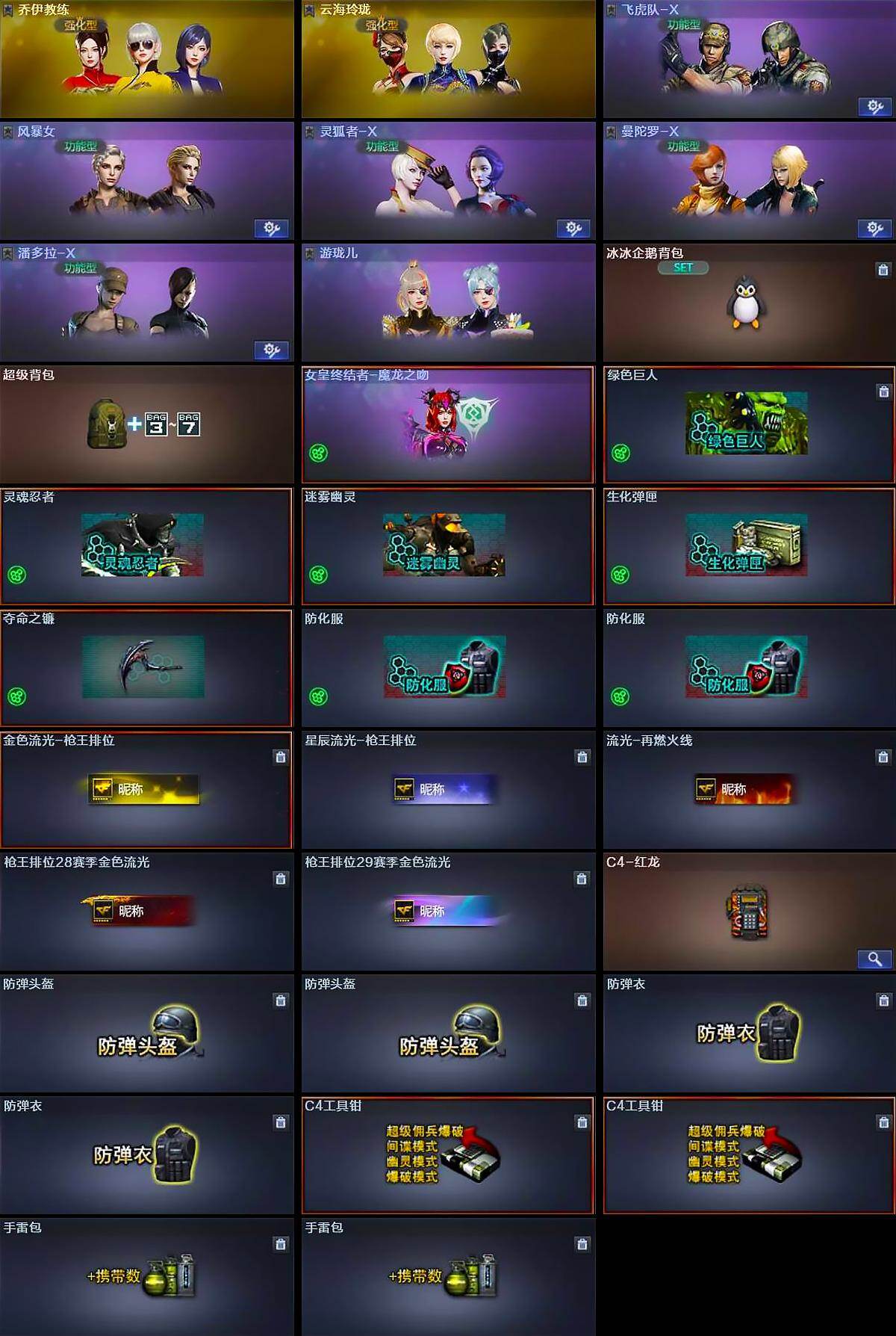 【道具】:冰冰企鹅背包,超级背包,女皇终结者-魔龙之吻,绿色巨人,灵魂忍者,迷雾幽灵,生化弹匣,夺命之镰,防化服*2,金色流光-枪王排位,星辰流光-枪王排位,流光-再燃火线,枪王排位28赛季金色流光,枪王排位29赛季金色流光,C4-红龙,防弹头盔*2,防弹衣*2,C4工具钳*2,手雷包*2