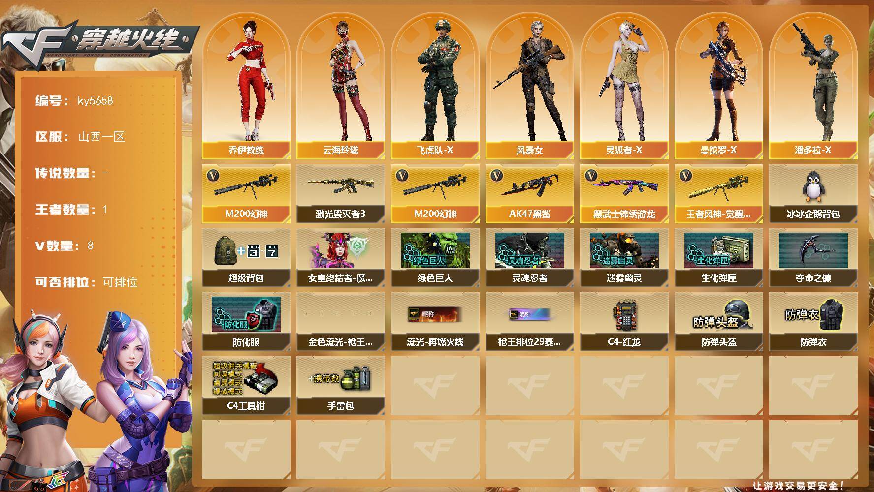 - [16848930]北京一区-12V-1王者-0炫金 【传说武器】:传说灵眸 【热门武器】:传说灵眸,死亡之眼,RPK-盘龙*3 【音效卡】:死神-雪域霜狐-怀旧音效卡 【皮肤】:毁灭-黑大圣皮肤,毁灭-风暴,轻型军用手斧-再燃火线 【角色】:王者葵-惊若翩鸿,雪域霜狐,修道士,风暴女,灵狐-花神,灵狐者-X,龙儿-小淘气,麻雀,潘多拉-甜心教官 【人偶武器】:迷你裂空之翼,迷你生化手雷*2 【暴走生化】:死亡之眼,超级对讲机 【英雄级武器】:M4A1-黑龙,死神-雪域霜狐,QBZ03-独角-III,RPK-盘龙*3,炼狱-风暴 【道具】:CFS限定背包,云山科技背包,裂空之翼背包-金色,超级背包,雪域霜狐炫彩背包,救世主-黑桃战神,绿色巨人,变异宝贝,夺命之镰,防化服*2,语音特效-怀旧,雪域霜狐表情,防弹头盔*4,防弹衣*4,C4工具钳*4,手雷包*4 【特殊枪械】:3盘龙