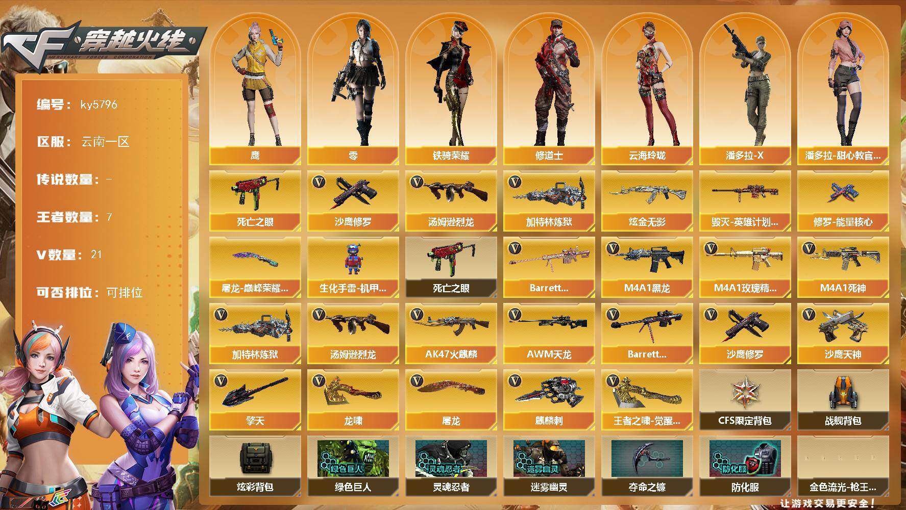 - [16323102]福建一区-37V-14王者-0炫金 【传说角色】:传说艾莉莎 【热门武器】:QBZ03-金色蔷薇,M200-幻神,死亡之眼,柯尔特-冠军之特,炼狱-迷你小钢,M4A1-黑骑士,沙鹰-修罗*4,金刚伞 【王者炫金武器】:王者青龙,王者霜心,王者星霆,王者之魄高爆手雷*3,王者之魄闪光弹*3,王者之魄烟雾弹*2 【音效卡】:M200-幻神音效卡,Barrett-碧霄极光音效卡 【皮肤】:M200-幻神-黄忠皮肤,幻神-宠儿-2021MVP,幻神-降龙,幻神-电流骇客 皮肤,金色蔷薇-热带奇洋 皮肤,雷神-荣耀之魄,雷神-传奇N9,M4A1-战神赵云,火麒麟-轻羽皮肤,火麒麟-平天大圣,火麒麟-百城,毁灭-英雄计划 皮肤,M4A1-千变-孔明皮肤,天龙-秘银,极光-能量核心,屠龙-星火燎原,屠龙-春桃 皮肤,擎天-冠军之击 【角色】:王者-零-国色天香,王者凌霄,王者空,奇洋探员,初恋灵狐,电竞少女,飞虎队-X,风暴女,嘉年华灵狐,娟娟,兰-海滩派对,灵动武士,零-水下丽影,灵狐者-七夕宝贝,麻雀,潘多拉-X,潘多拉-甜心教官,青霞仙子,蜀雪,雪莉杨-摸金校尉,樱-战斗天使,职业选手 【人偶武器】:白虎-迷你小艾,火麒麟-灵狐,炼狱-迷你小钢,AWM-灵狐-15周年嘉年华,迷你牛牛,生化手雷-机甲核心,AK47-斯沃特,Barrett-夜玫瑰 【暴走生化】:死亡之眼,超级对讲机 【挑战大师】:冰龙粉碎者-白马银枪,激光毁灭者III,神圣爆裂者-末日III 【英雄级武器】:AK47-火麒麟,M4A1-雷神,M4A1-黑骑士,AK47-无影,AK12-天启,AN94-超新星,AK47-黑鲨,无影-神兵利器,QBZ03-云龙,黑武士-锦绣游龙,超新星-热带奇洋,QBZ03-金色蔷薇,王者之魄-觉醒版,白虎之魄-觉醒版,AWM-天龙,Barrett-毁灭,Barrett-极光,M200-幻神,王者之光-觉醒版,沙鹰-修罗*4,柯尔特-冠军之特,COP 357-云龙,USP-神工天巧,屠龙*2,擎天,麒麟刺,龙啸-热带奇洋,高爆手雷-神工天巧,高爆手雷-云龙,手雷-热带奇洋,闪光弹-神工天巧,闪光弹-云龙,烟雾弹-神工天巧,M4A1-赤狱骑士 【道具】:奇洋探员-海龟背包,炫彩背包,热带奇洋炫彩背包,黄金巨石泰坦-魔花研究所背包,黄金生化钩,绿色巨人,灵魂忍者,变异宝贝,迷雾幽灵