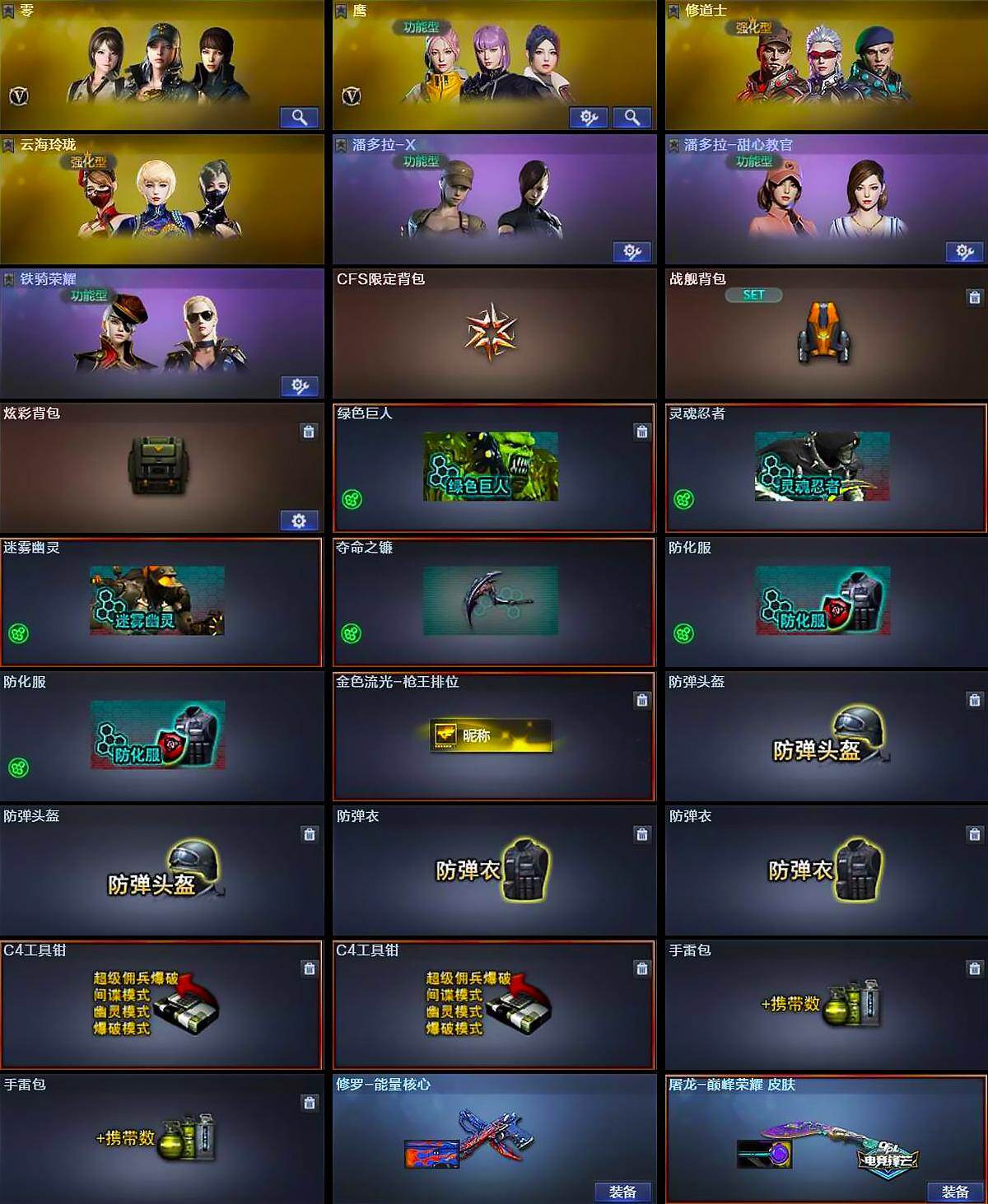 【道具】:CFS限定背包,战舰背包,炫彩背包,绿色巨人,灵魂忍者,迷雾幽灵,夺命之镰,防化服*2,金色流光-枪王排位,防弹头盔*2,防弹衣*2,C4工具钳*2,手雷包*2